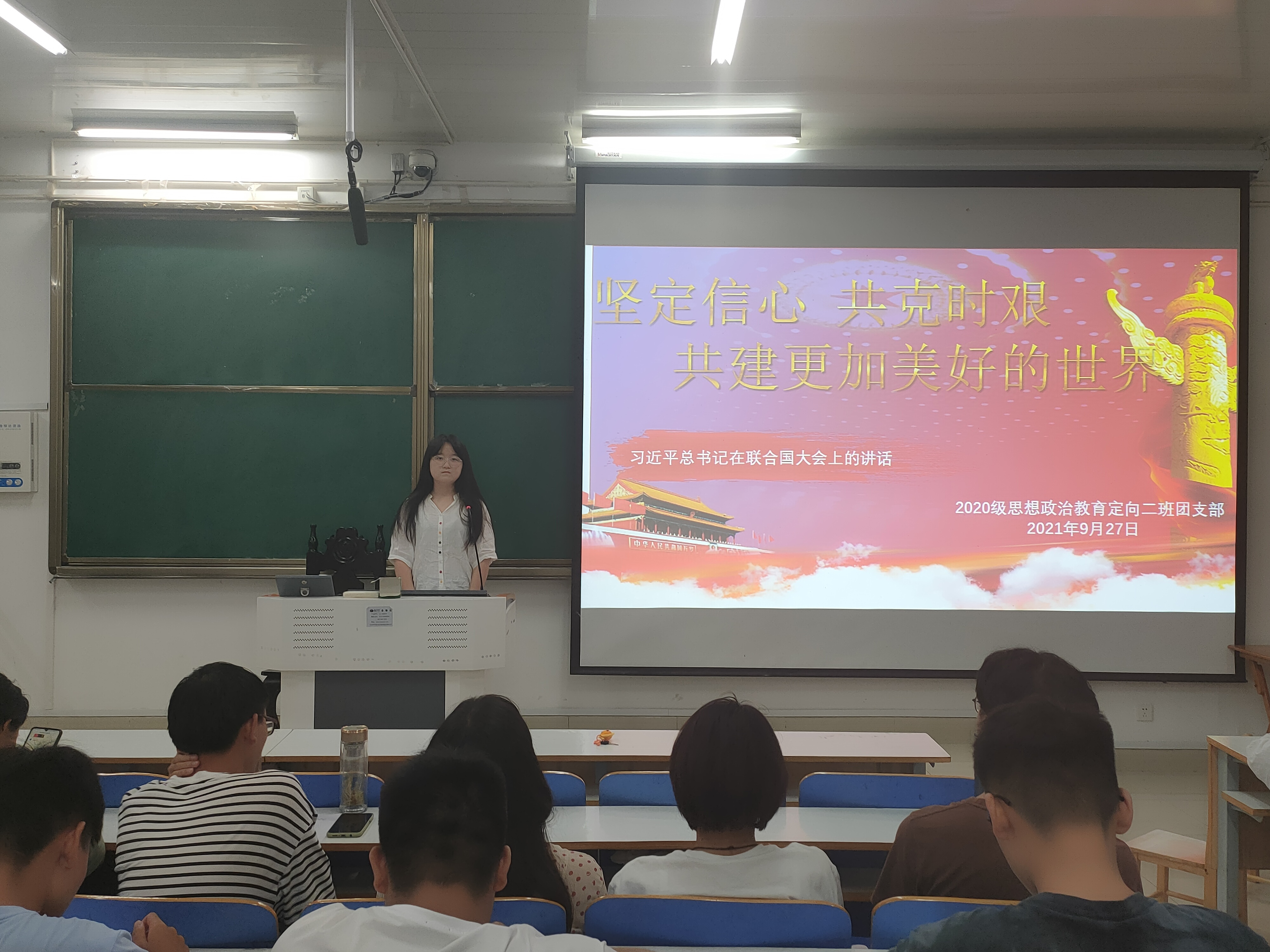 9月27日上午,德赢AC米兰官网2020级思想政治教育二班、定向二班在社科楼514教室顺利开展学习国家主席习近平《坚定信念,共克时艰,共建更加美好的世界》重要讲话精神团支部大会。二班、定向二班全体团员共同参与本次大会。会议由孙毓含主持。