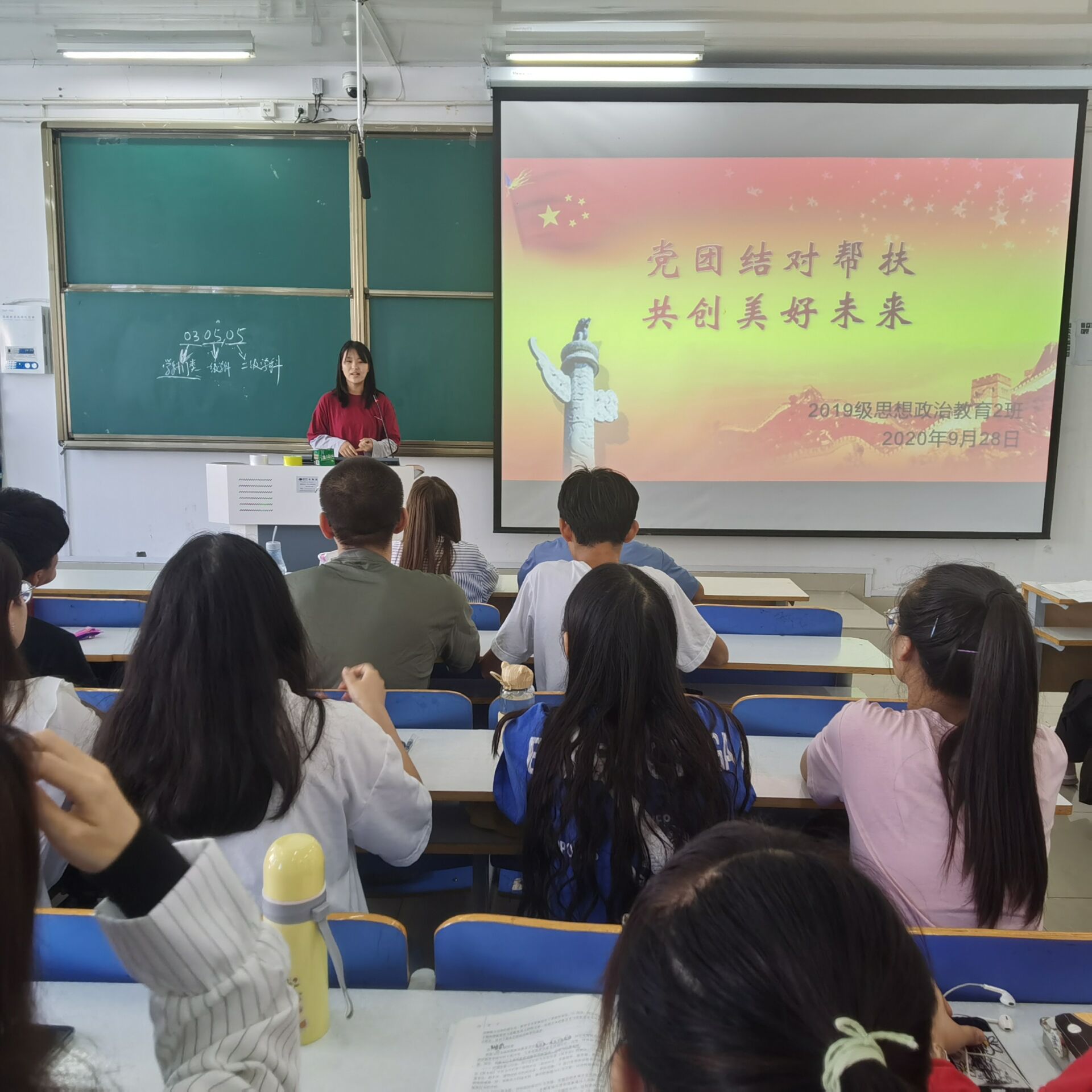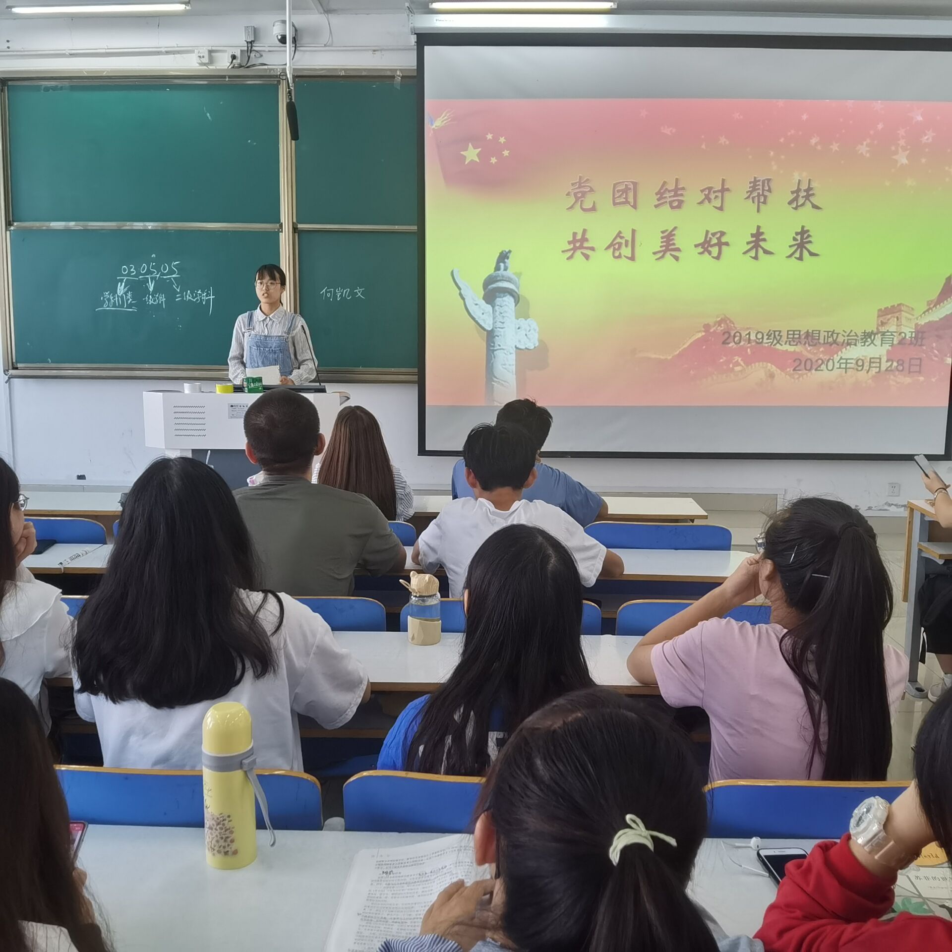9月28日上午,德赢AC米兰官网2019级思想政治教育二班在社科楼516教室召开了“党团结对帮扶,共创美好未来”主题会议。德赢官网预备党员张晓艳、王文芳及2019级思想政治教育二班全体成员共同参会。会议由团支书孙雅娴主持。