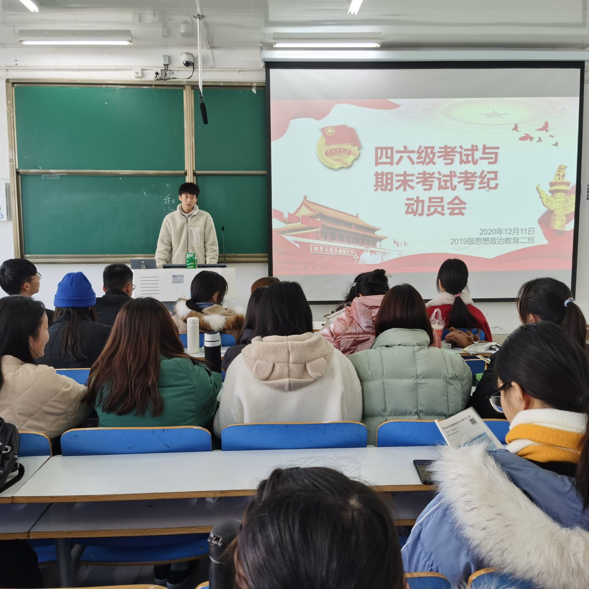 为帮助同学们更好地应对英语四级考试与期末考试,严肃考场纪律。12月11日下午,德赢AC米兰官网2019级思想政治教育二班在社科楼514教室召开了大学生英语四级考试与期末考试动员大会。辅导员陶青青和德赢AC米兰官网2019级思想政治教育二班全体成员共同参会。本次会议由副班长吕昂主持。