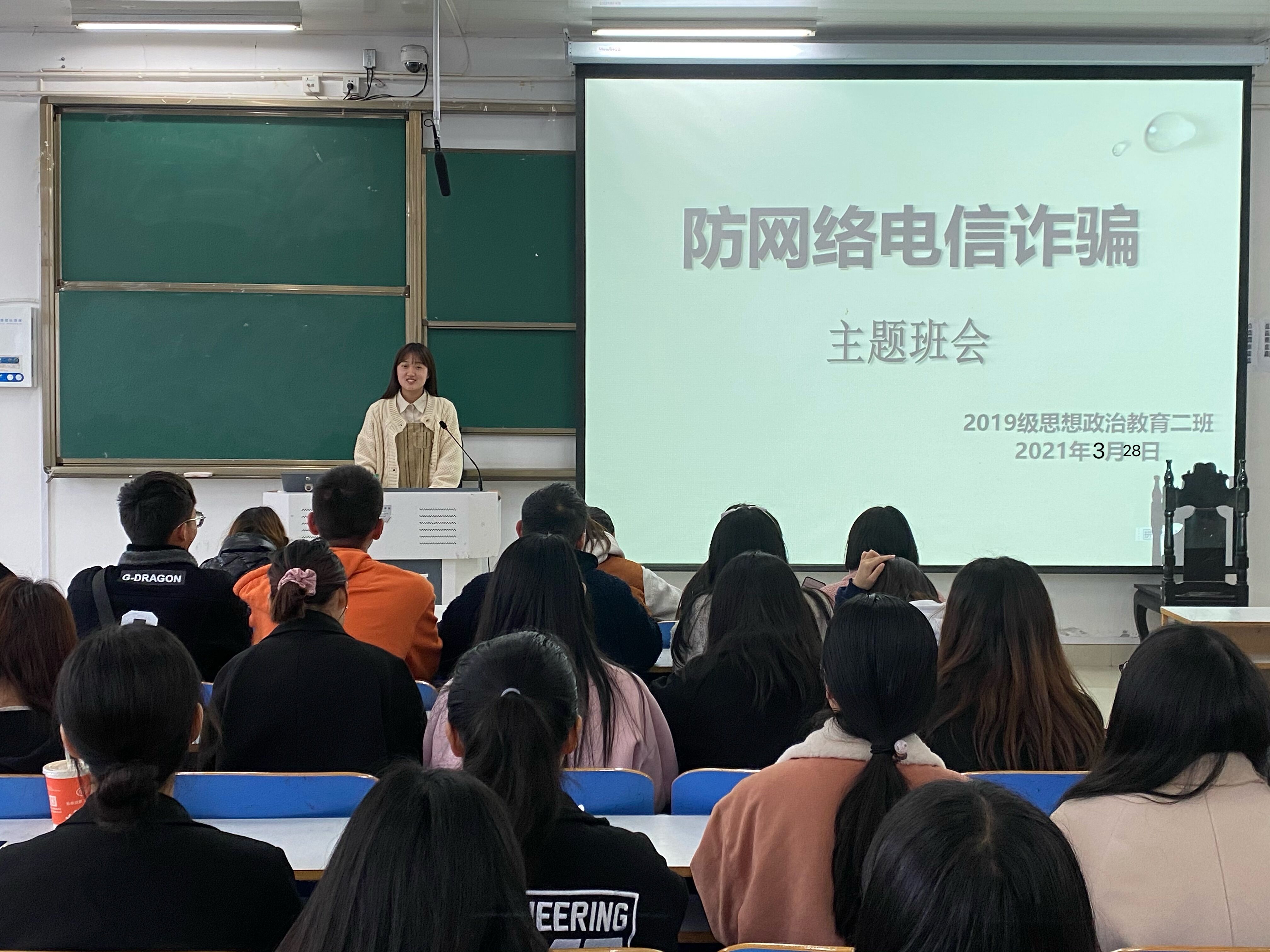 为进一步提升我校大学生网络防诈骗意识,增强防范网络诈骗能力,3月28日上午,德赢官网2019级思想政治教育二班在社科楼516教室召开“防网络电信诈骗”主题会议。2019级思想政治教育二班全体成员共同参会。会议由团支书孙雅娴主持。