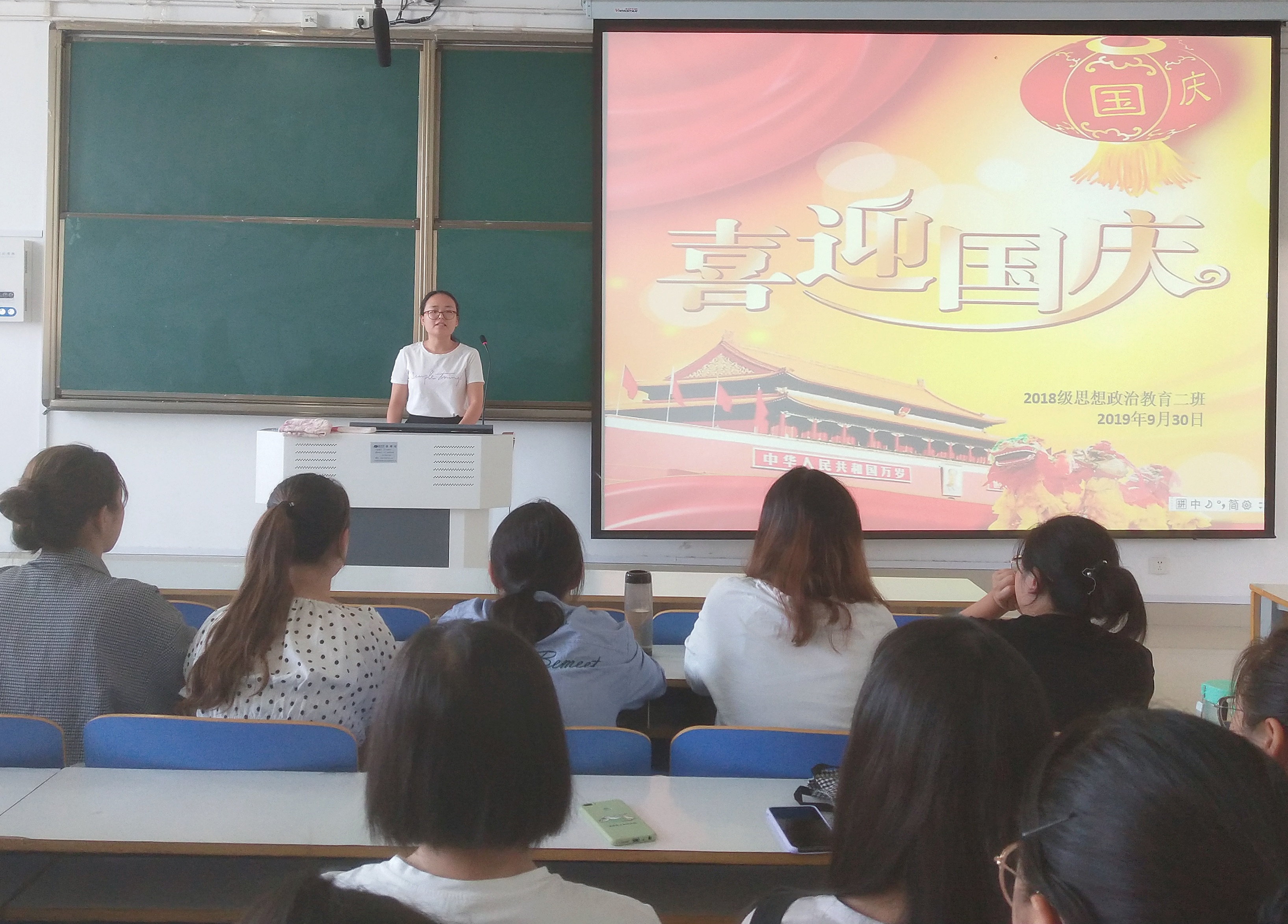 9月30日上午,德赢官网2018级思想政治教育二班在社科楼514教室开展了“喜迎祖国七十华诞”主题班会。辅导员曹菁菁、2018级思想政治教育二班全体成员共同参加了本次班会。班会由班长杨康主持。