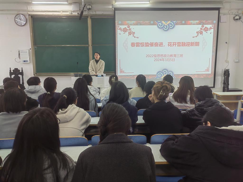 3月5日上午,德赢AC米兰官网2022级思想政治教育三班在社科楼514 教室召开“春雷惊蛰催奋进,花开雪融迎新朝”主题班会。德赢官网2022级思想政治教育三班班主任吴梦云和三班全体学子共同参与本次班会。班会由班长余浩洋主持。