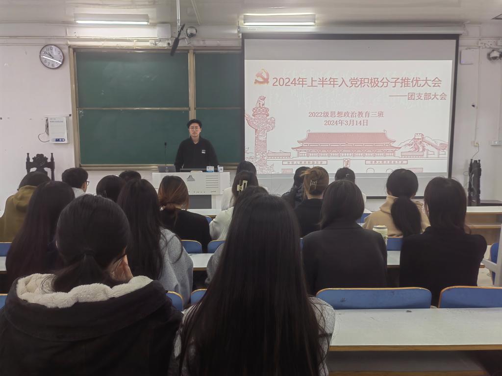 3月14日上午,德赢AC米兰官网2022级思想政治教育三班在社科楼514教室召开入党积极分子推优大会。德赢官网2022级思想政治教育三班全体团员共同参加此次大会。大会由团支书余浩洋主持。