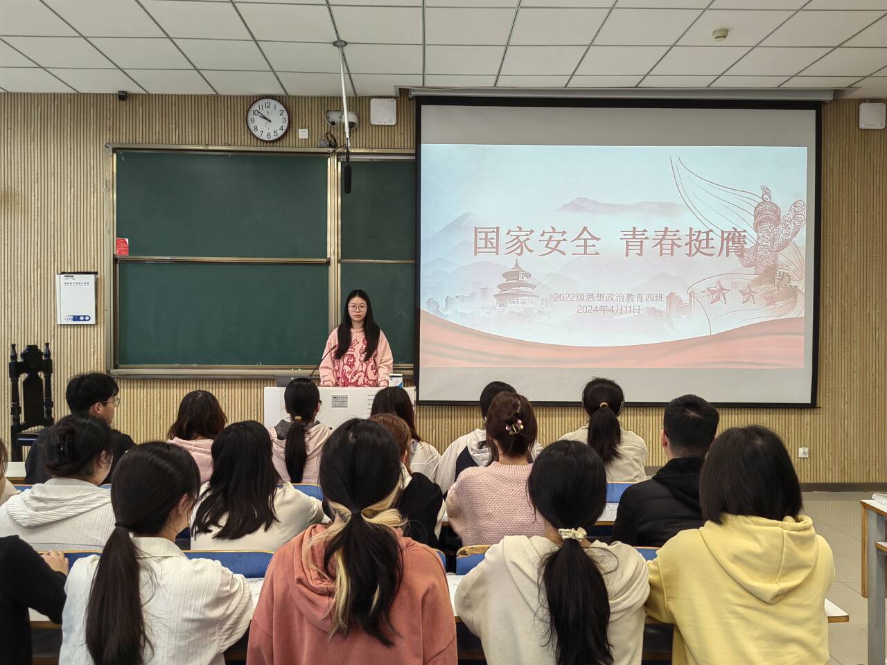 为全面贯彻党的二十大和二十届二中全会精神,增强学生的国家安全意识,培养学生的担当精神,4月11日上午,德赢AC米兰官网2022级思想政治教育四班在社科楼515教室组织召开“国家安全,青春挺膺”主题团课。德赢官网2022级思想政治教育四班全体成员参与本次团课。本次团课由团支书牛志杰主持。
