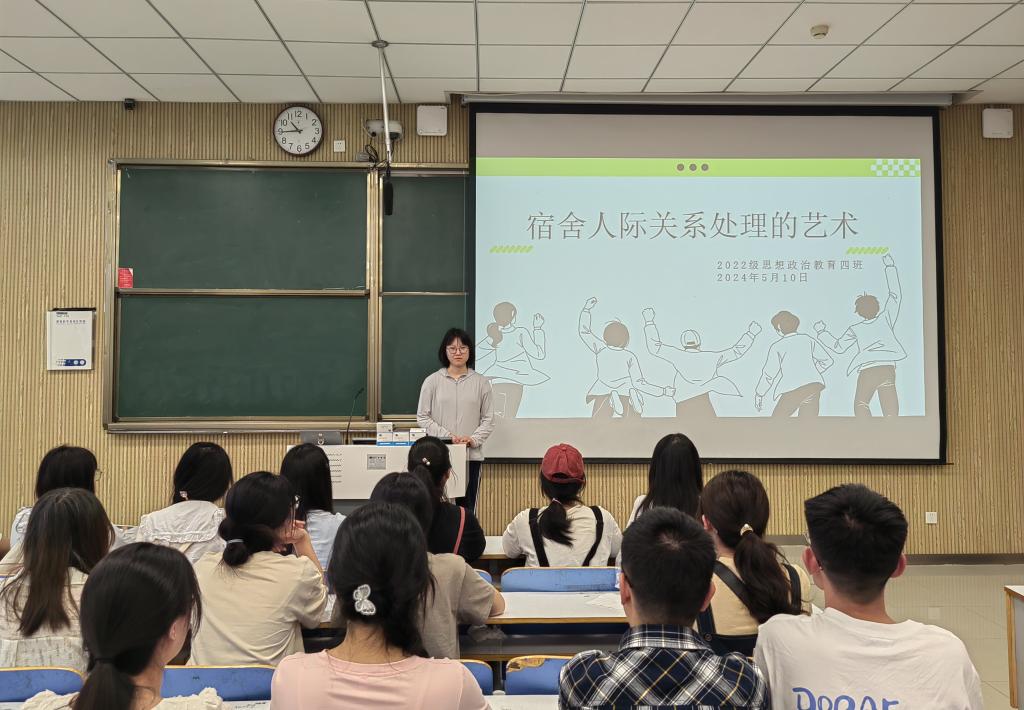 为进一步提高学生的心理健康水平,优化学生的心理素质,引导广大学生关爱自我的心理健康,5月10日上午,德赢AC米兰官网2022级思想政治教育四班在社科楼515教室组织召开“宿舍人际关系处理的艺术”心理班会。德赢官网2022级思想政治教育四班全体成员参与本次班会。本次班会由心理委员徐成若主持。
