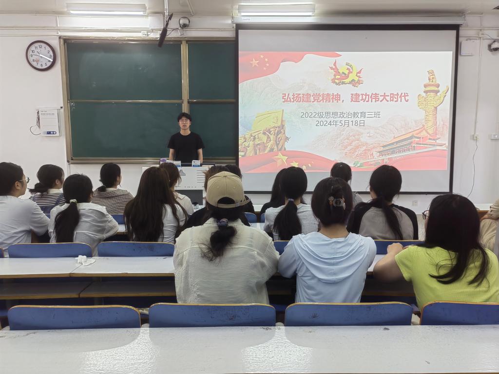 为弘扬建党精神,增强奋斗信念,5月18日上午,德赢AC米兰官网2022级思想政治教育三班在社科楼514教室召开“弘扬建党精神,建功伟大时代”主题团课。德赢官网2022级思想政治教育三班全体成员共同参加此次团课。团课由团支书余浩洋主持。
