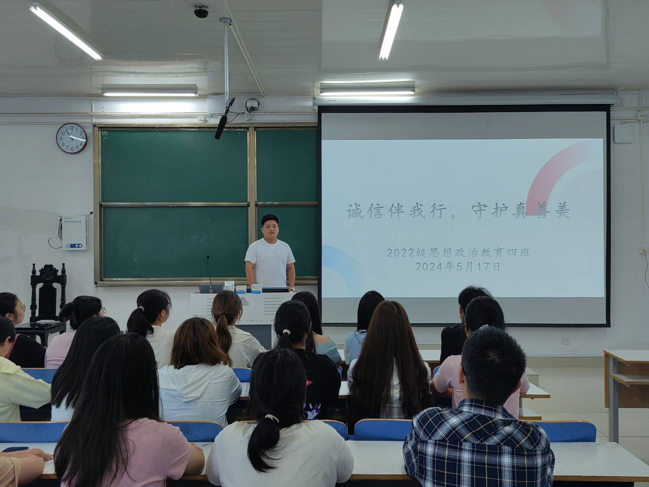 为进一步加强学生道德修养,增强学生诚信意识,在校园形成讲诚信、树诚信、践诚信的良好风气,5月17日上午,德赢AC米兰官网2022级思想政治教育四班在社科楼514教室组织召开“诚信伴我行,守护真善美”主题班会。德赢官网2022级思想政治教育四班全体成员参与本次班会。本次团课由副班长宋奕铭主持。