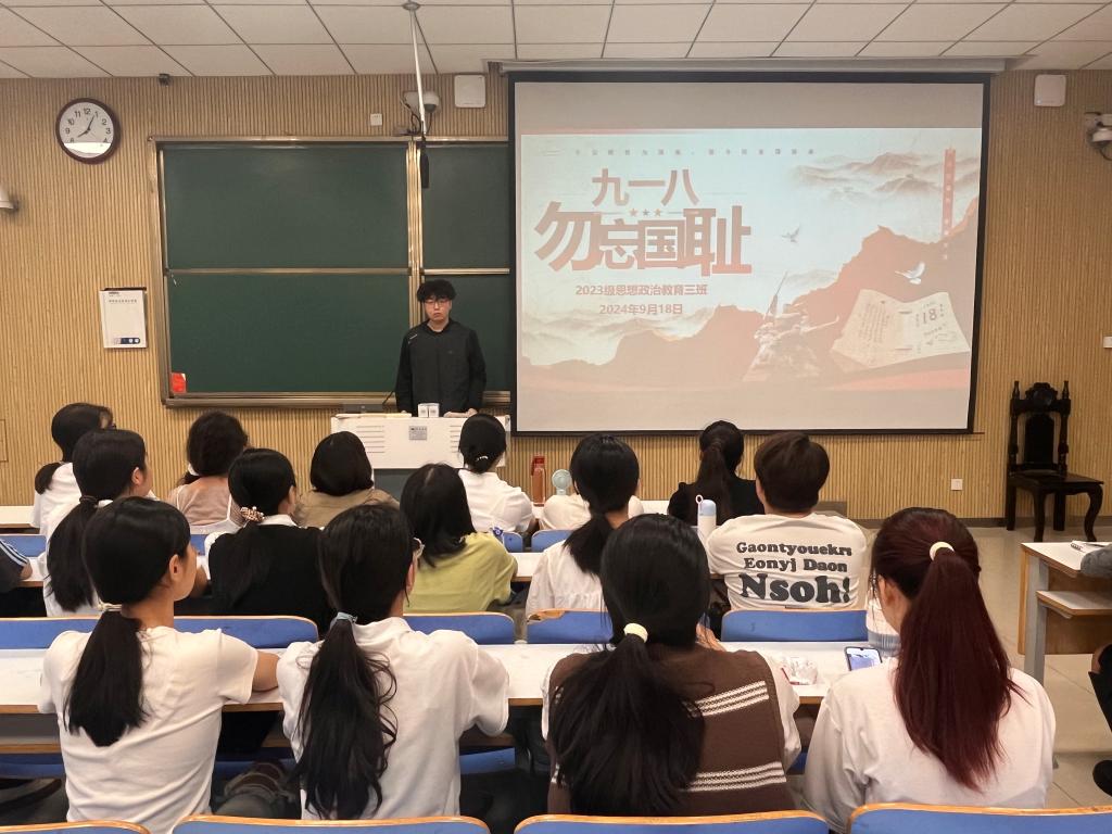 9月18日上午,德赢AC米兰官网2023级思想政治教育三班在社科楼515召开“九一八,勿忘国耻”主题班会。德赢官网2023级思想政治教育三班全体同学共同参与本次班会,班会由团支书郝瀚主持。