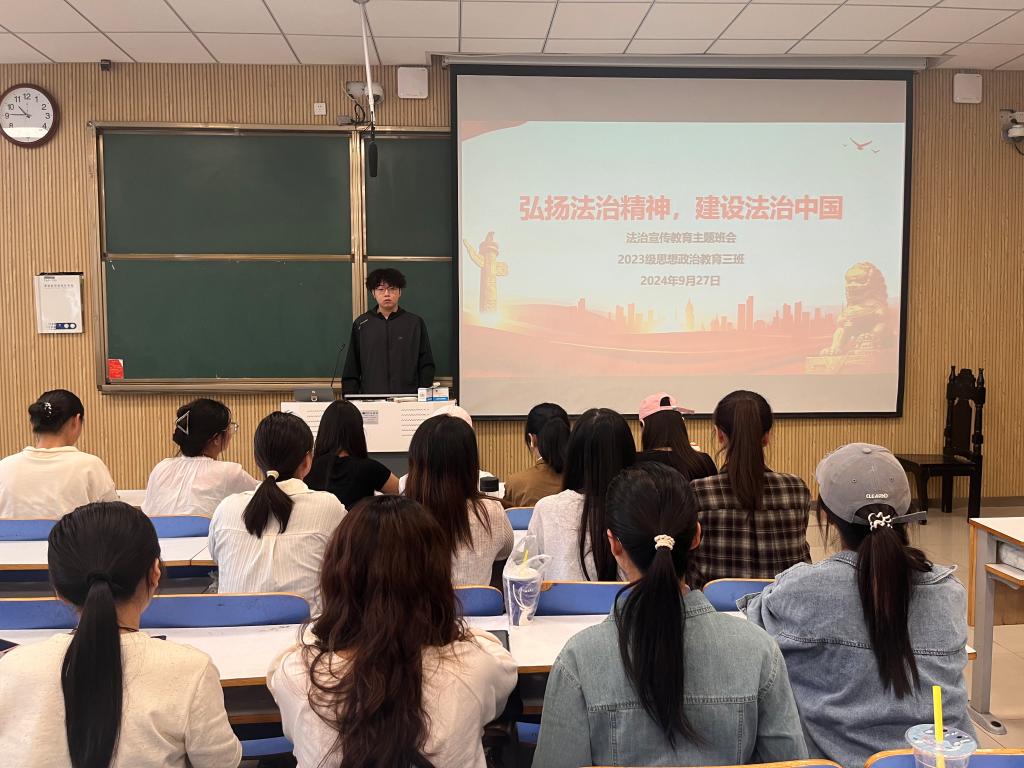 9月27日上午,德赢AC米兰官网2023级思想政治教育三班在社科楼515召开“弘扬法治精神,建设法治中国”主题班会。德赢官网2023级思想政治教育三班全体同学共同参与本次班会,班会由团支书郝瀚主持。