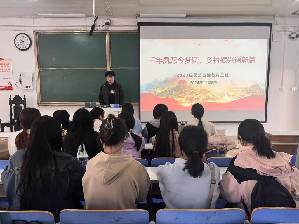 11月8日上午,德赢AC米兰官网2023级思想政治教育三班在社科楼515召开“千年夙愿今梦圆,乡村振兴谱新篇”主题团课。德赢官网2023级思想政治教育三班全体同学共同参与本次团课,团课由团支书郝瀚主持。