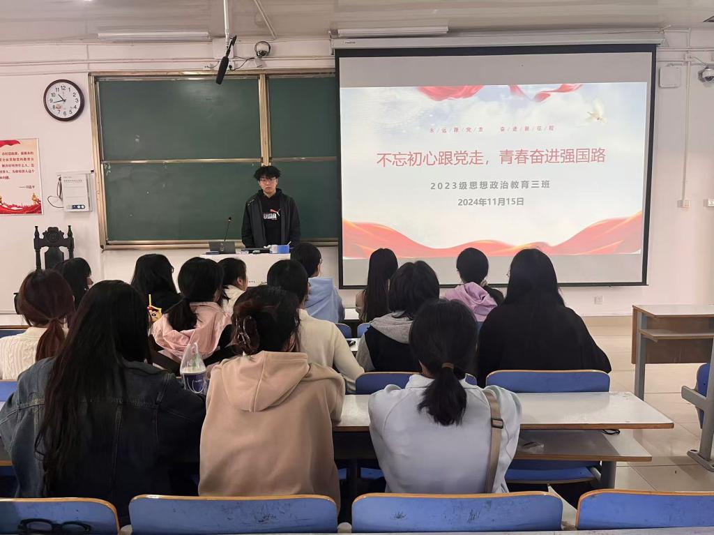 11月15日上午,德赢AC米兰官网2023级思想政治教育三班在社科楼515召开“不忘初心跟党走,青春奋进强国路”主题团课。德赢官网2023级思想政治教育三班全体同学共同参与本次团课,团课由团支书郝瀚主持。