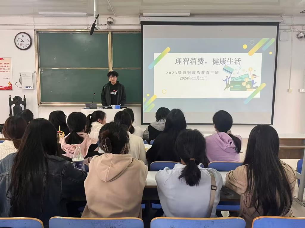 为帮助学生树立正确的消费观,11月11日上午,德赢AC米兰官网2023级思想政治教育三班在社科楼515召开“理智消费,健康生活”主题班会。德赢官网2023级思想政治教育三班全体同学共同参与本次班会,班会由团支书郝瀚主持。