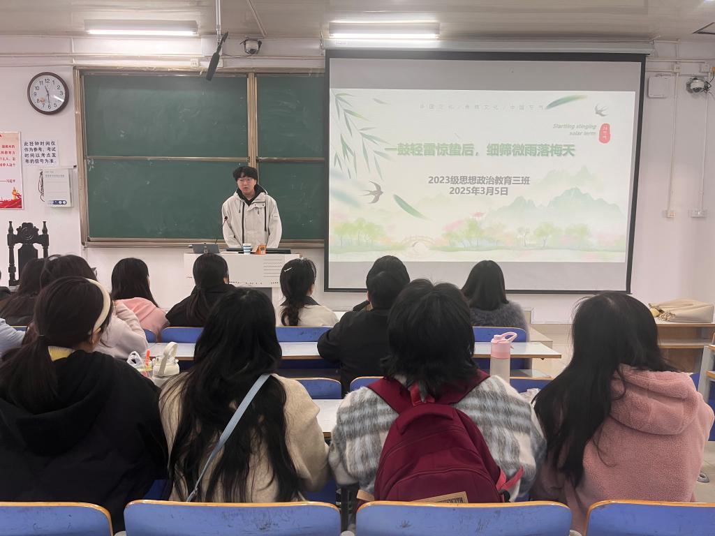 班会伊始,郝瀚通过朗诵《秦楼月·浮云集》中“浮云集。轻雷隐隐初惊蛰。”开启了此次班会。接着,郝瀚向同学们介绍了惊蛰的来历。他指出,惊蛰是二十四节气中的第三个节气,通常出现在每年的3月5日或6日,标志着春天的正式开始。这一时期,春雷开始鸣响,惊醒了蛰伏在土中的昆虫,象征着万物复苏,大地重新充满生机。接着,同学们相互分享家中关于惊蛰的独特记忆、风俗习惯等,并通过知识竞赛活跃班级气氛。最后,郝瀚做出总结,惊蛰这一节气的由来不仅反映了古代中国对自然现象的细致观察,还体现了古人在农业生产和日常生活中对自然规律的深刻理解和运用。通过节气名称的演变,也可以看出历史文化对语言的影响。