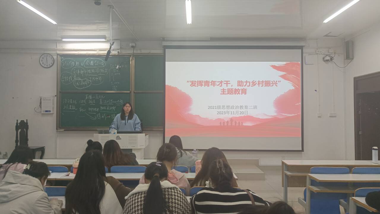 11月20日下午,德赢AC米兰官网2021级思想政治教育二班在社科楼514教室召开“发挥青年才干,助力乡村振兴”主题团课。2021级思想政治教育二班全体团员参加此次团课。团课由团支书王婧欣主持。