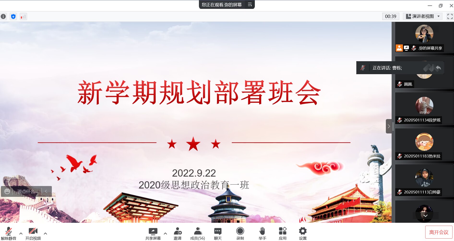 9月22日下午,德赢AC米兰官网2020级思想政治教育一班在腾讯会议上召开新学期规划部署班会。2020级思想政治教育一班全体同学及班主任曹栋共同参加此次班会。班会由曹栋主持。