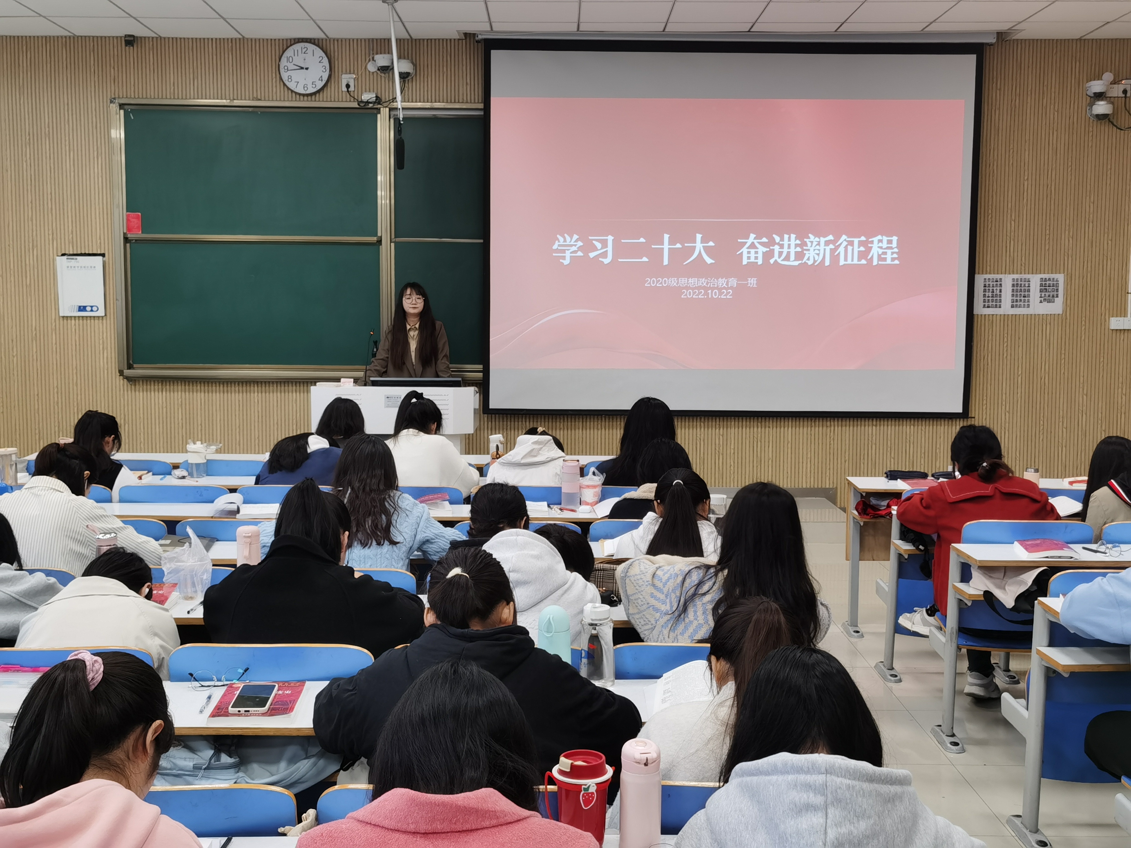 团课伊始,卢茜雨邀请一些同学上台分享自己观看二十大的心得收获。接着,她指出,党的二十大是在全党全国各族人民迈上全面建设社会主义现代化国家新征程、向第二个百年奋斗目标进军的关键时刻召开的一次十分重要的大会,是一次举旗定向、领航指路、团结奋进、继往开来的大会。她强调,作为思政学子,我们要用先进的思想理论武装大脑,不断提高思想认识,坚定理想信念,切实将理论学习成果化作奋斗的不竭动力。