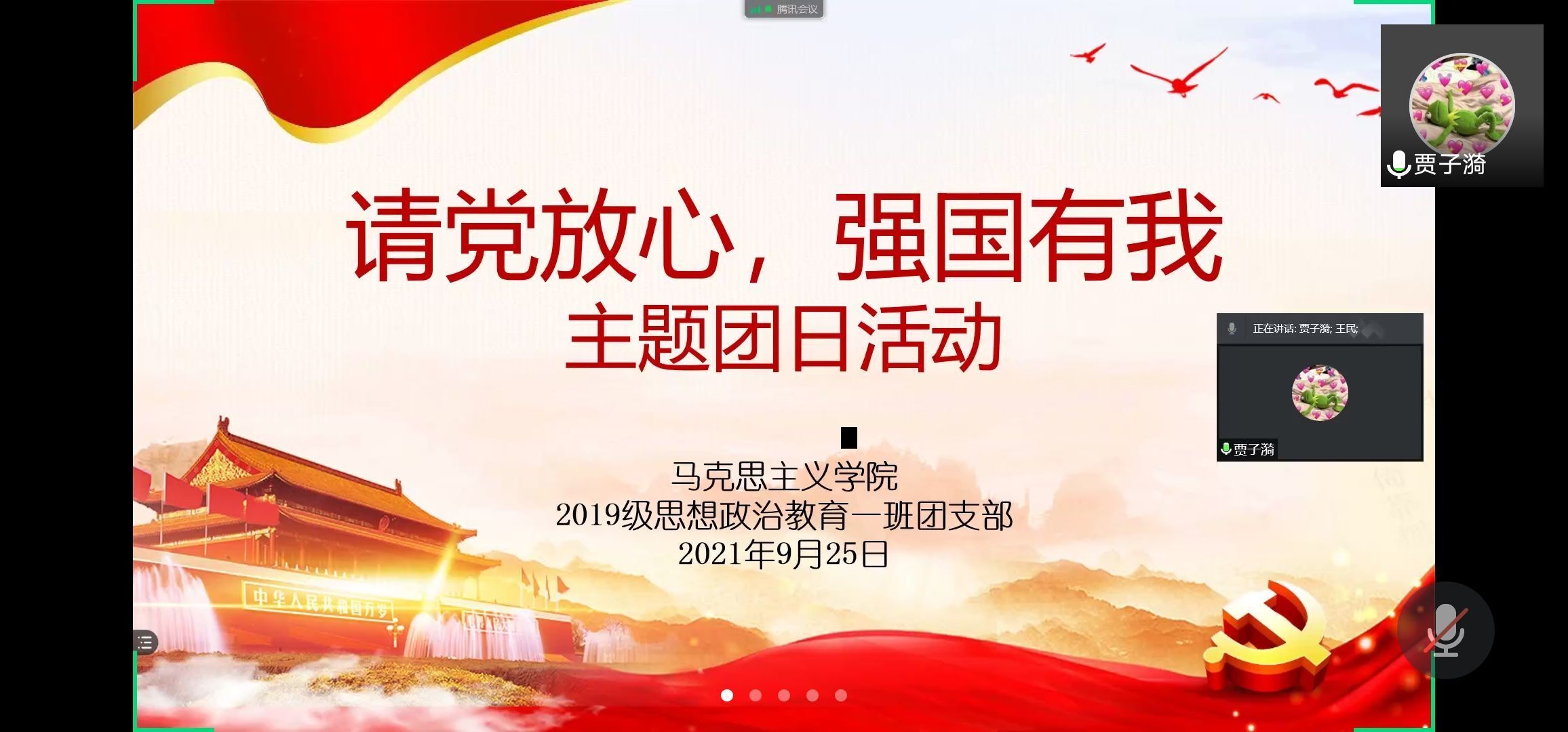 9月25日下午,德赢AC米兰官网2019级思想政治教育一班第一团支部在腾讯视频举办“请党放心,强国有我”主题团日活动。德赢AC米兰官网2019级思想政治教育一班全体团员参加本次活动。活动由团支书贾子漪主持。