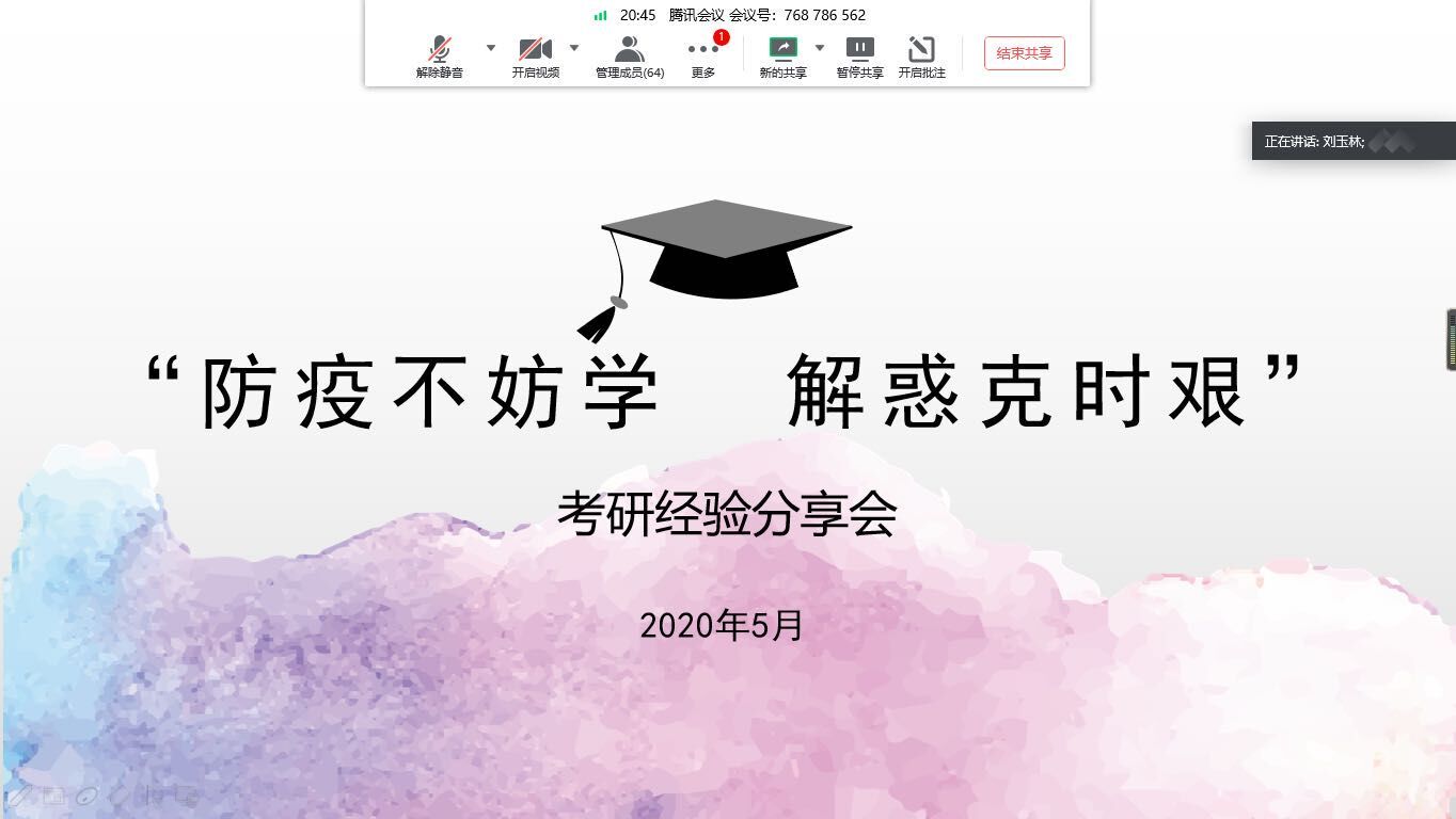 为使同学们坚定信心,提高疫情期间学习效率,学习2020届研究生考试拟录取学姐的宝贵经验,5月29日晚上,2017级思想政治教育一班通过腾讯会议线上平台,顺利召开“防疫不妨学,解惑克时艰”主题班会。吉林大学研究生院拟录取学姐张雅琼、华东政法大学研究生院拟录取学姐吴晨晨、湖南大学研究生院拟录取学姐刘玉林、2017级思想政治教育一班全体同学和辅导员曹菁菁共同参与班会。会议由班长邹创主持。