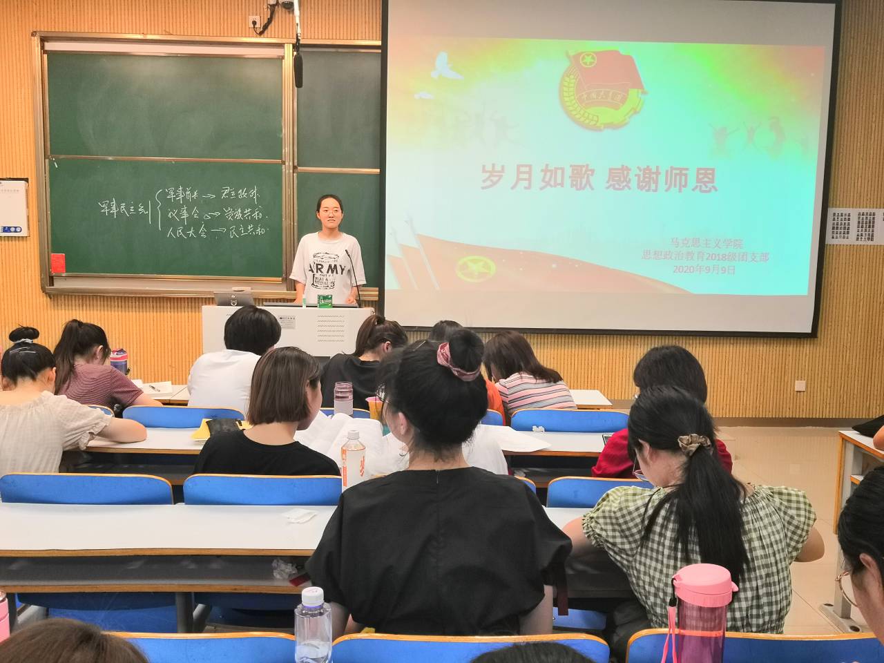 9月8日上午,德赢AC米兰官网2018级思想政治教育团支部在社科楼515教室顺利开展“岁月如歌,感谢师恩”主题团会。2018级全体学生共同参加此次会议。会议由第二团支部书记黄子晋主持。