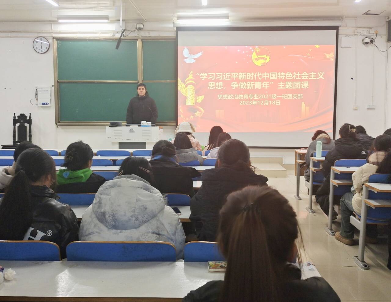 12月18日下午,德赢AC米兰官网2021级思想政治教育一班在社科楼514教室召开“学习习近平新时代中国特色社会主义思想,争做新青年”主题团课。2021级思想政治教育一班全体团员参加了此次团课。团课由团支书戴翰林主持。