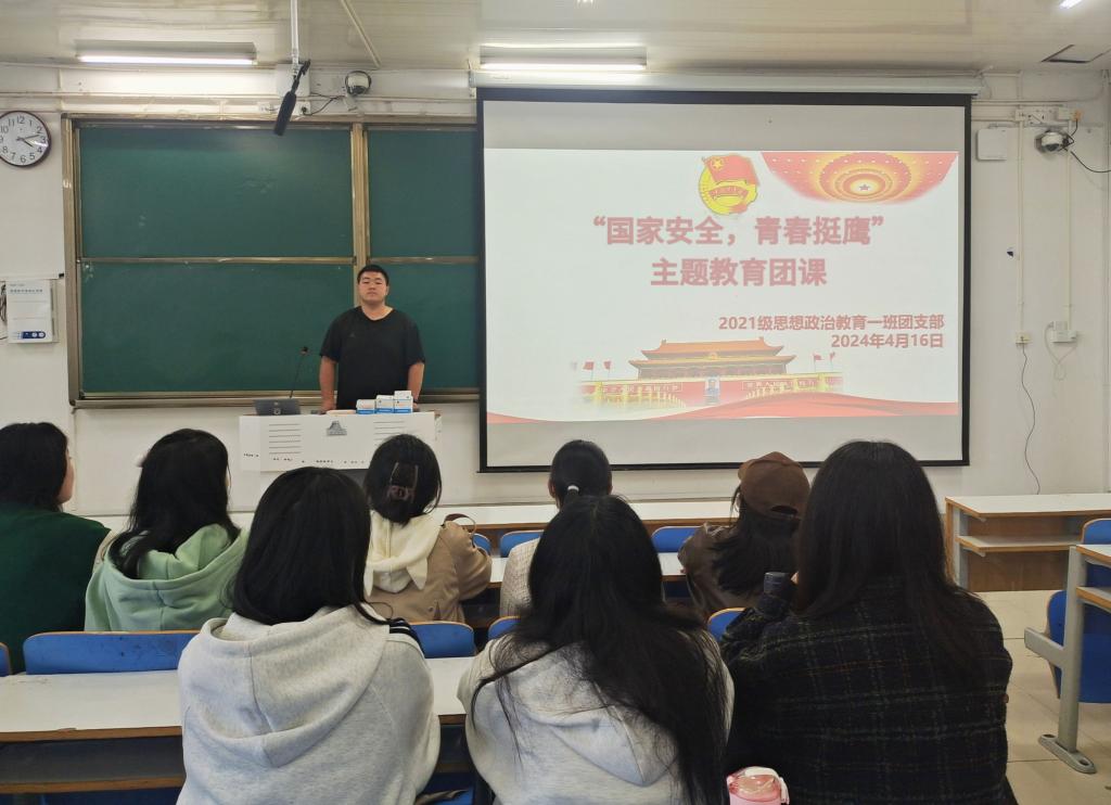 为深入贯彻总体国家安全观,进一步增强学生的国家安全意识,培养学生的爱国情怀,4月16日下午,德赢AC米兰官网2021级思想政治教育一班在社科楼514教室召开“国家安全,青春挺鹰”主题团课。2021级思想政治教育一班全体团员参加了本次团课。团课由团支书戴翰林主持。