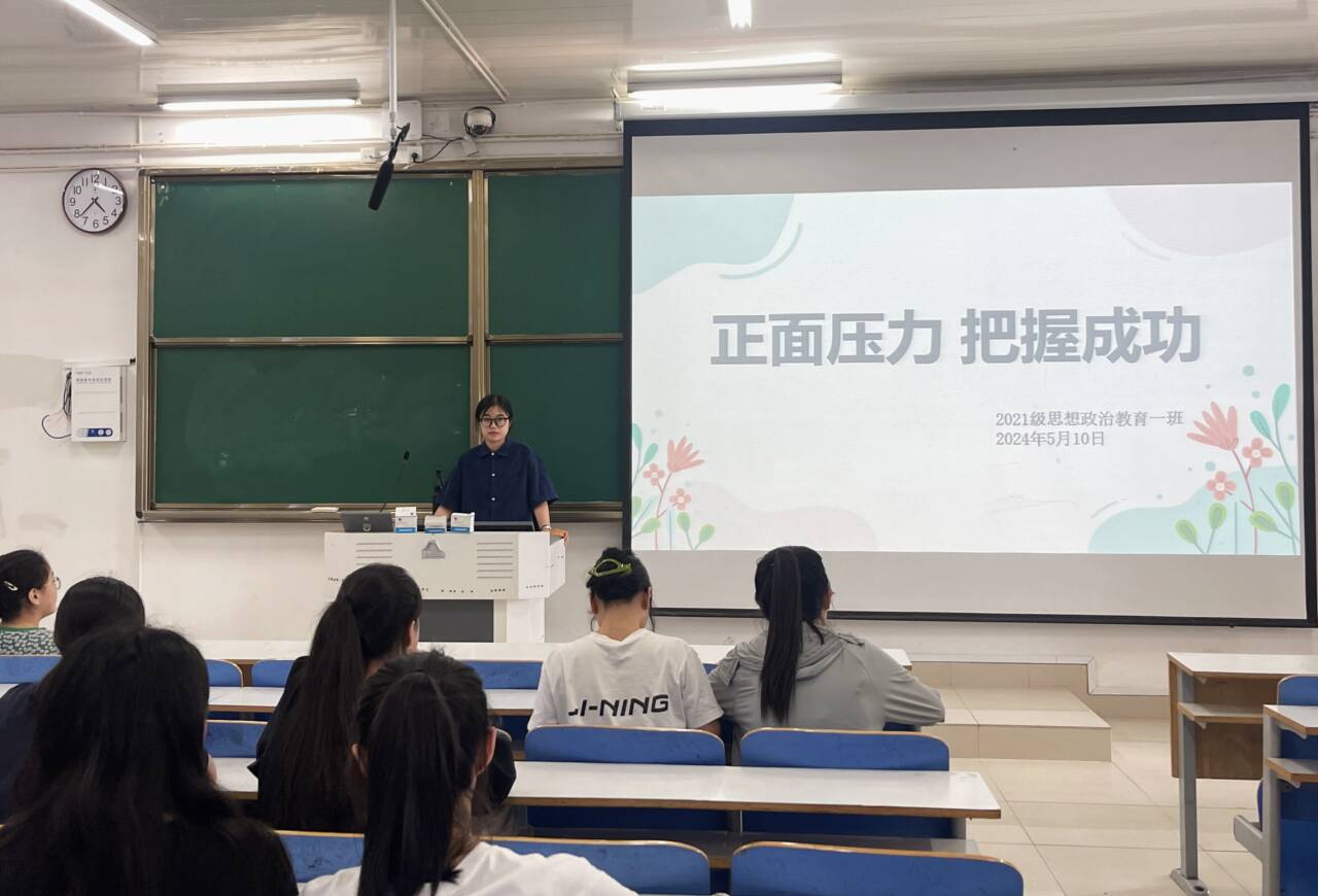 为全面贯彻党的教育方针,推进素质教育,促进学生的思想品德素质和心理健康成长,5月10日下午,德赢AC米兰官网2021级思想政治教育一班在社科楼514教室召开“正面压力,把握成功”心理班会。2021级思想政治教育一班全体学生参加此次班会。班会由心理委员黄小妍主持。