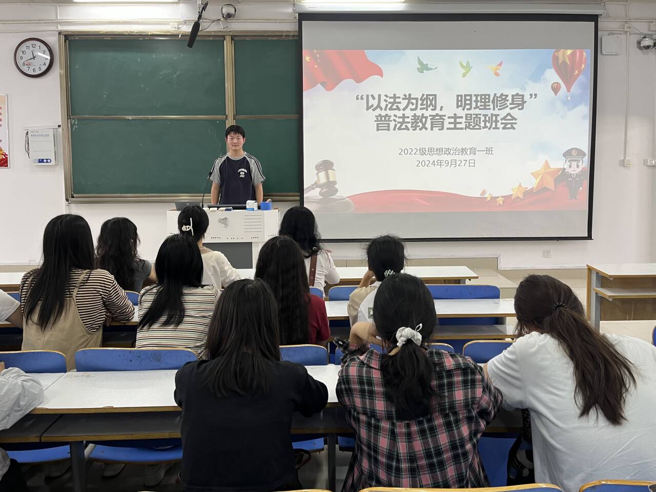 为深入贯彻习近平法治思想,培养学生的法治观念,9月27日上午,德赢AC米兰官网2022级思想政治教育一班在社科楼514教室召开“以法为纲,明理修身”普法教育主题班会,德赢官网2022级思想政治教育一班全体同学共同参与本次班会,班会由副班长闻炎仲主持。
