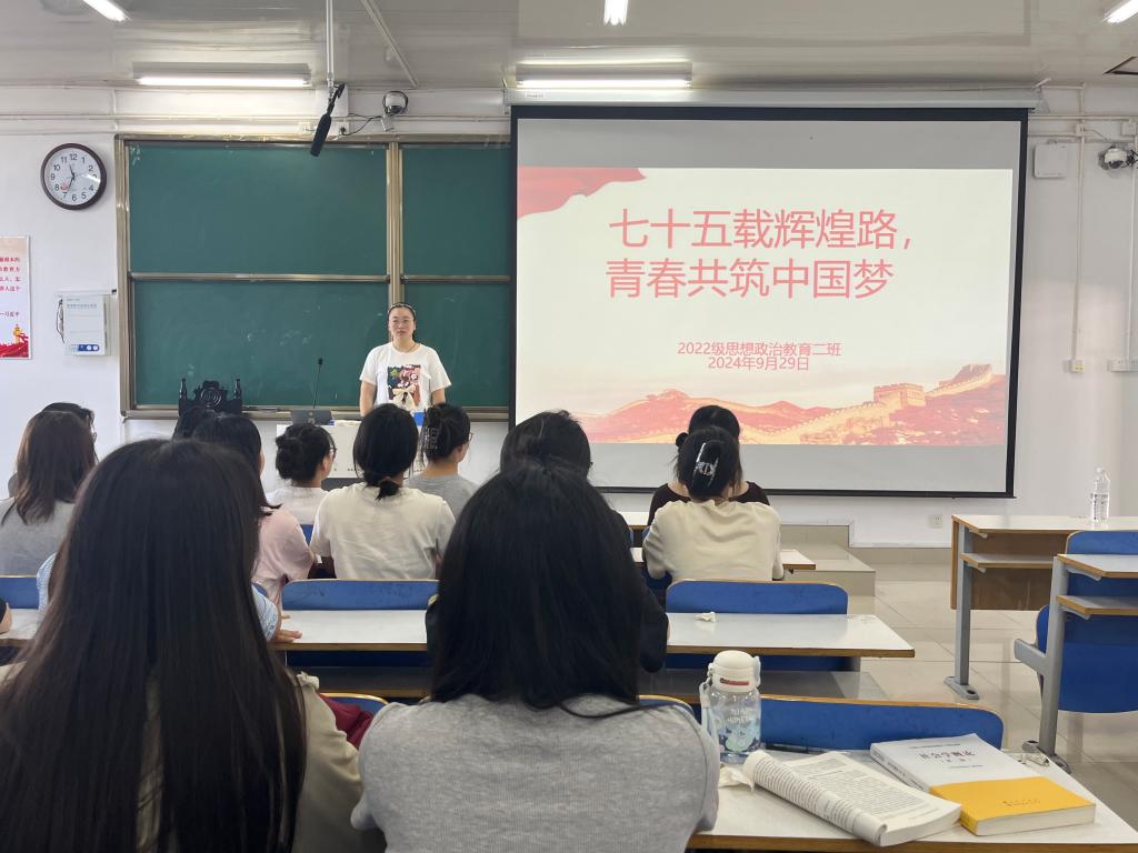 为热烈庆祝中华人民共和国成立75周年,弘扬爱国主义精神,9月30日上午,德赢AC米兰官网2022级思想政治教育二班在社科楼514教室召开“七十五载辉煌路,青春共筑中国梦”主题团课。德赢官网2022级思想政治教育二班全体成员共同参与此次团课。团课由团支书李佳音主持。