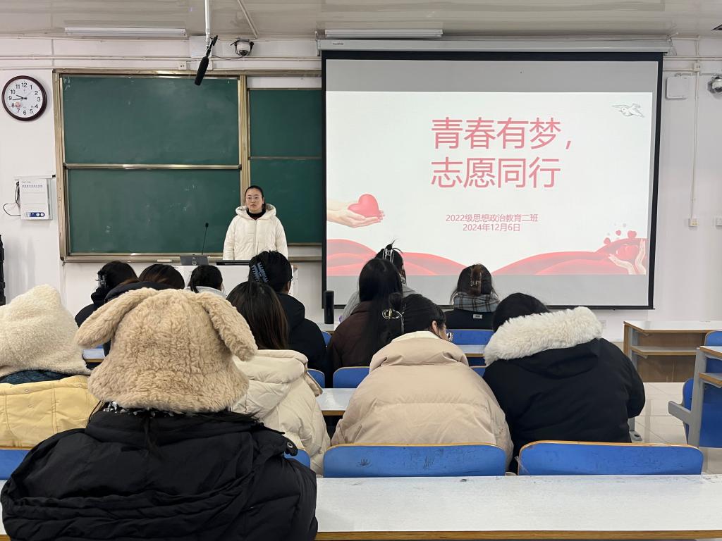 12月6日上午,德赢AC米兰官网2022级思想政治教育二班在社科楼514教室召开“青春有梦,志愿同行”主题团课。德赢官网2022级思想政治教育二班全体成员共同参与此次团课。团课由团支书李佳音主持。