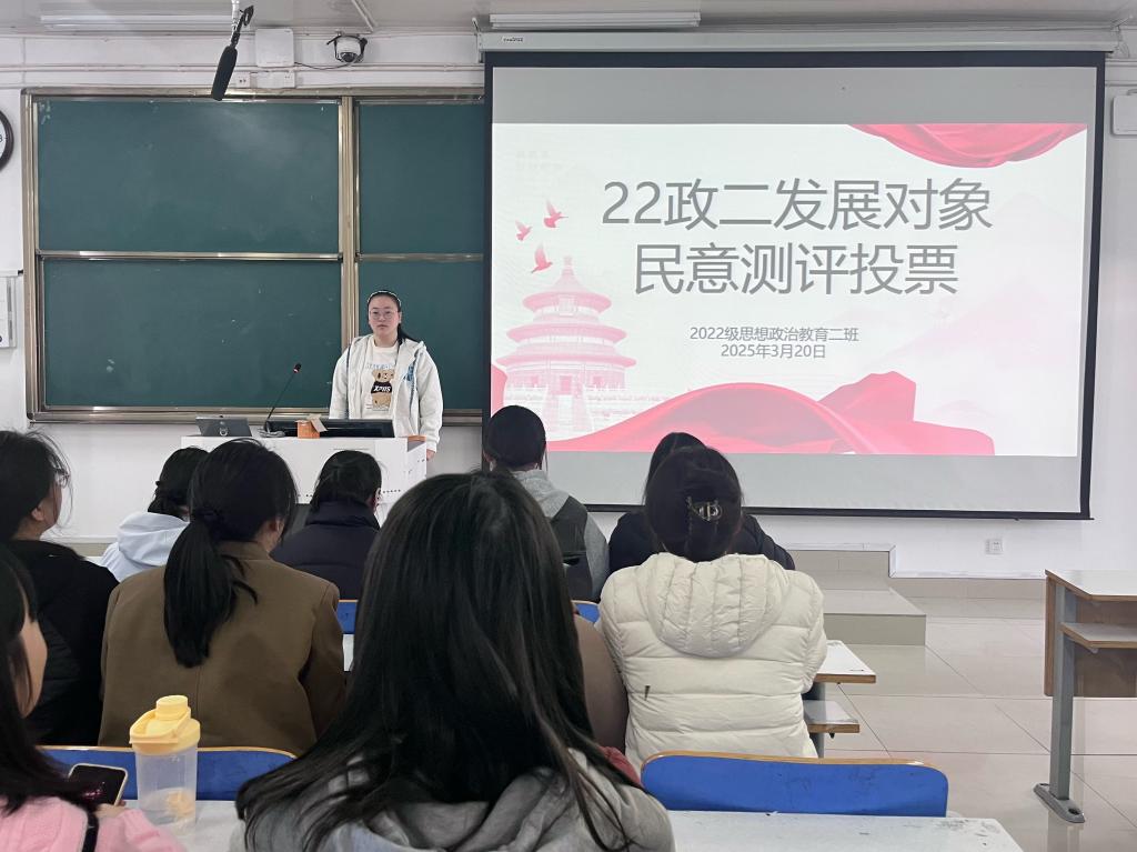 3月20日下午,德赢AC米兰官网2022级思想政治教育二班在社科楼514教室召开发展对象民意测评会。德赢官网2022级思想政治教育二班全体成员共同参与此次班会。会议由团支书李佳音主持。