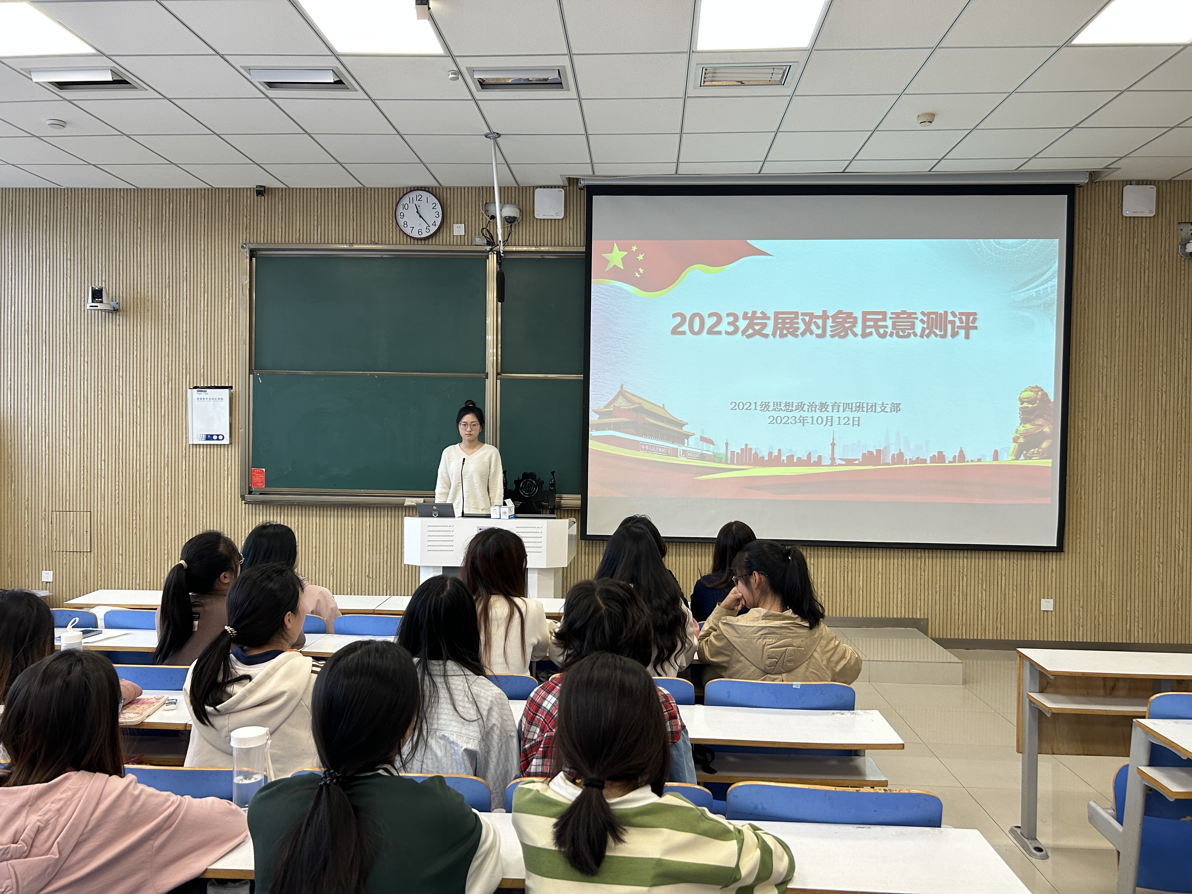 10月12日下午,德赢AC米兰官网2021级思想政治教育四班在社科楼514教室召开2023年发展对象民意测评会。2021级思想政治教育四班全体团员共同参会。会议由团支书刘珂含主持。