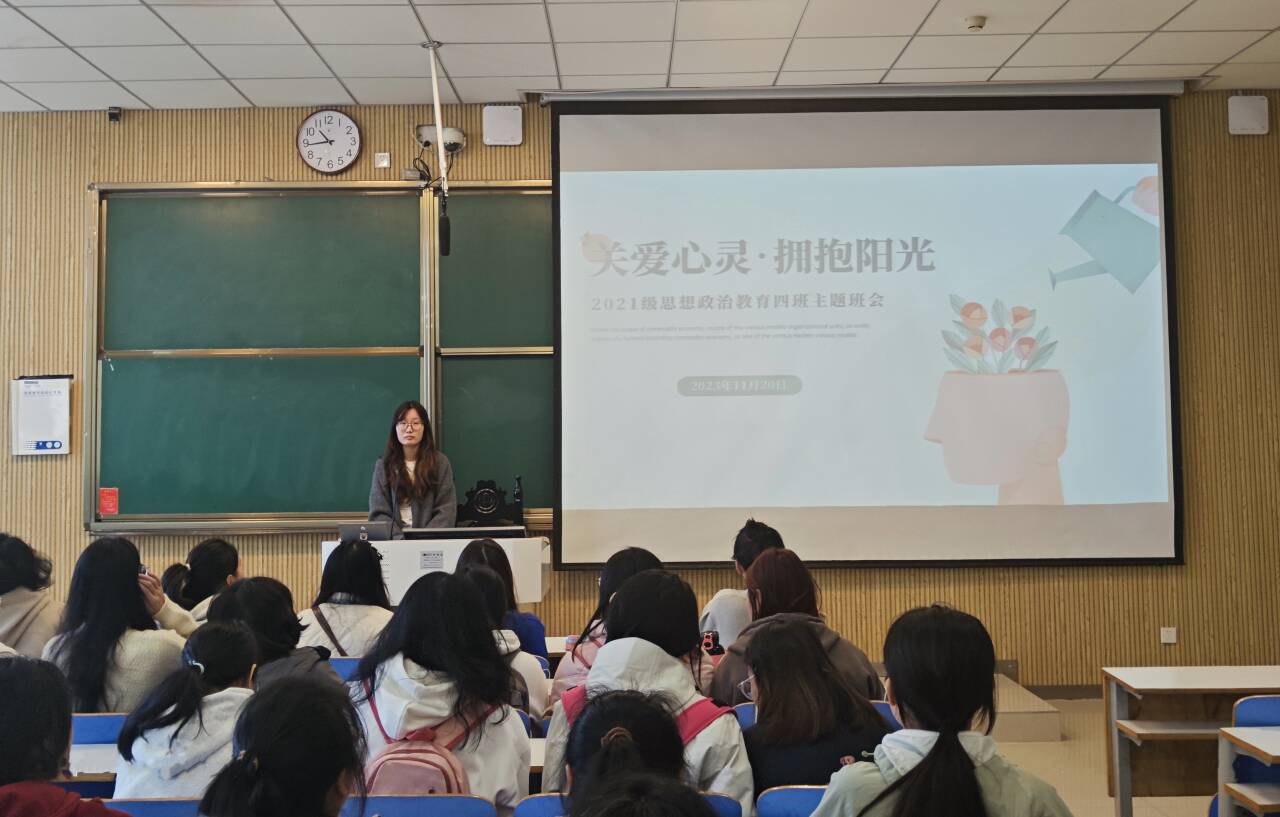 11月16日下午,德赢AC米兰官网2021级思想政治教育四班在社科楼514教室开展“关爱心灵,拥抱阳光”主题班会。2021级思想政治教育四班全体学生共同参加本次会议。会议由心理委员杨可主持。