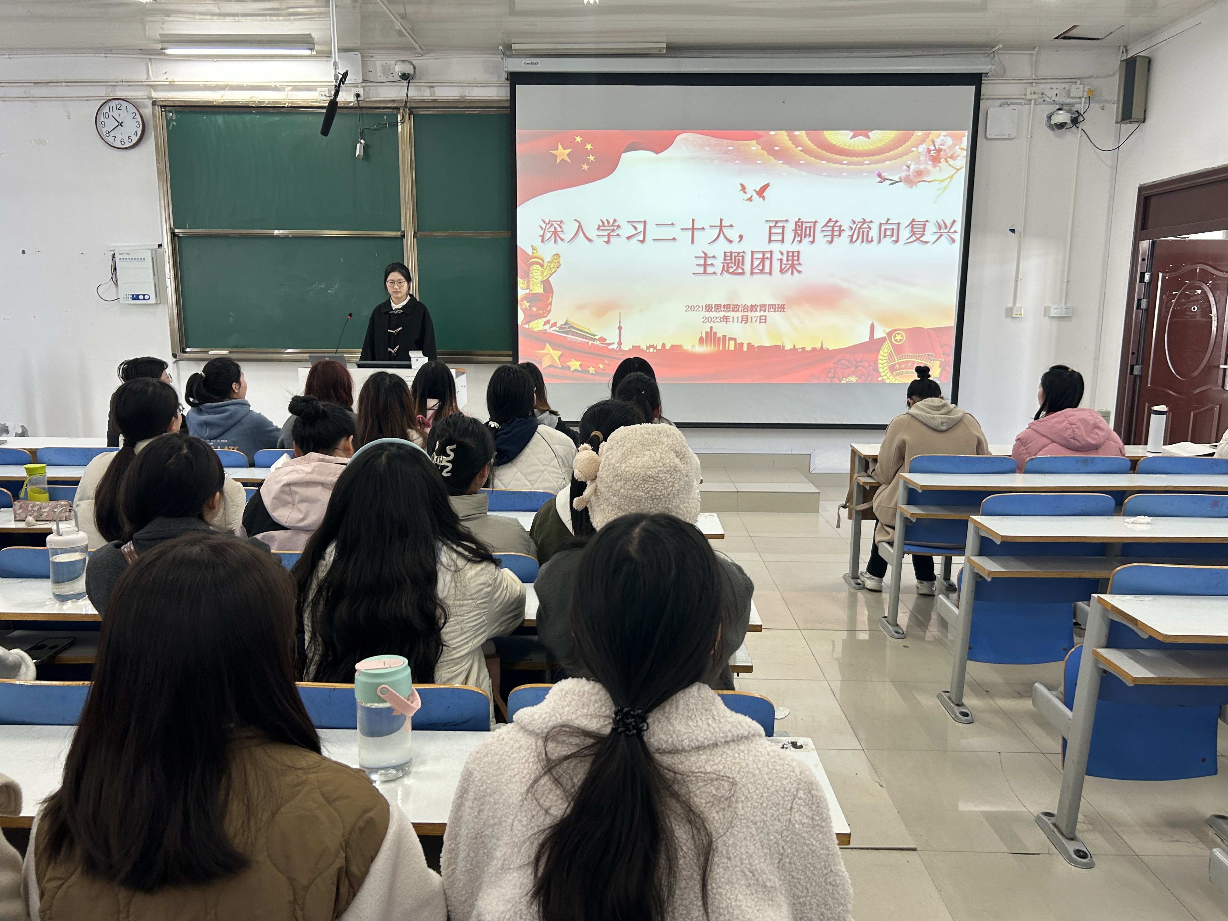 11月17日上午,德赢AC米兰官网2021级思想政治教育四班在社科楼515教室开展“深入学习二十大,百舸争流向复兴”主题团课。2021级思想政治教育四班全体学生共同参加本次团课。团课由团支书刘珂含主持。