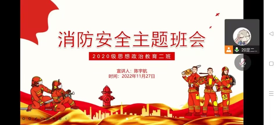 11月27日晚,德赢AC米兰官网2020级思想政治教育二班通过腾讯会议召开线上消防安全主题班会。2020级思想政治教育二班全体学生共同参与本次班会。班会由团支书陈宇航主持。