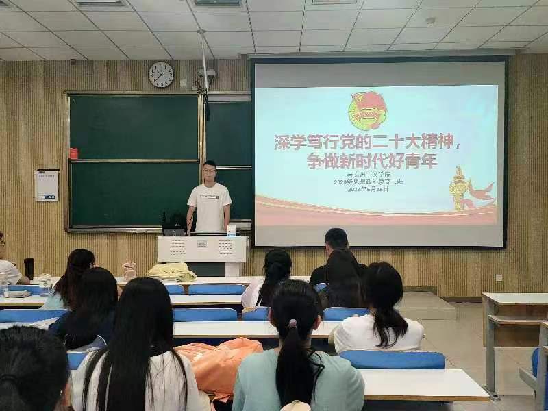 团课伊始,陈宇航总结了前一阶段我们支部学习宣传贯彻党的二十大精神的成果和经验。他指出,在学校和学院团委的正确引导下,我们支部积极响应相关号召,通过召开学习二十大专题组织生活会、开展社会实践调研和志愿服务活动等多种形式深学笃行,夯实学习成果。随后,陈宇航就如何进一步学习党的二十大精神为同学们提出三点建议。一是要坚持原原本本学。同学们要精读二十大报告,了解我国目前所处历史方位和未来发展方向。二是要深入思考学。各位同学要结合思想政治教育专业的突出特点,着重学习二十大报告中有关教育强国的重要论述,将自身发展与国家发展有机结合,自觉为教育事业贡献力量。三是要联系实际学。同学们要积极参加社会实践和志愿服务活动,在火热的实践中学习宣传贯彻党的二十大精神。团课最后,陈宇航作出总结。他指出,学习宣传贯彻党的二十大精神是一个长期的重要任务,同学们要常学、常思、常行,久久为功,将二十大精神转化为促进自身发展的强大精神动力。