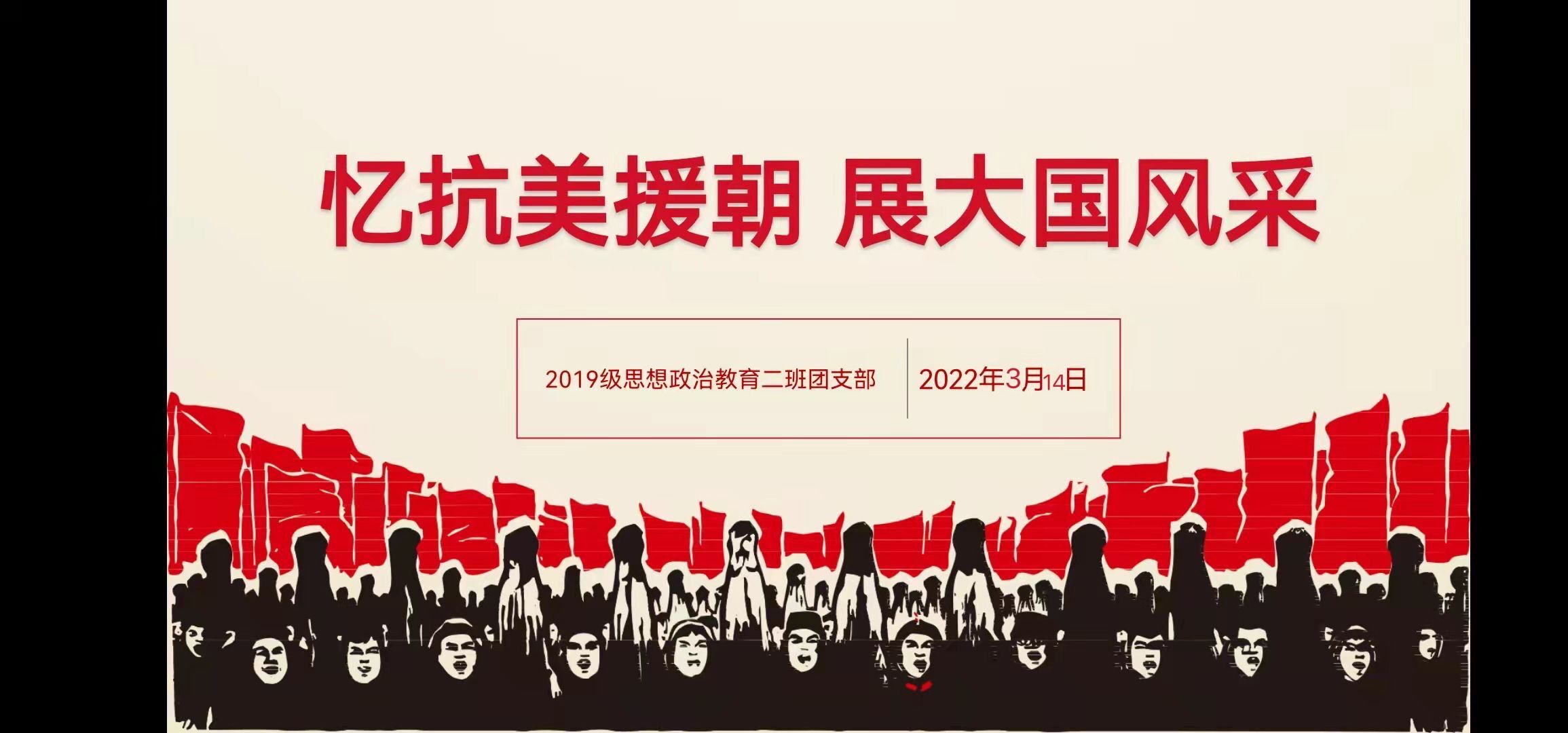 为缅怀革命先烈,弘扬民族精神,加强团员青年爱国主义教育,厚植爱国主义情怀,3月14日上午,德赢官网2019级思想政治教育二班在腾讯会议召开“忆抗美援朝,展大国风采”网上主题团课。2019级思想政治教育二班全体成员共同参会。会议由团支书孙雅娴主持。