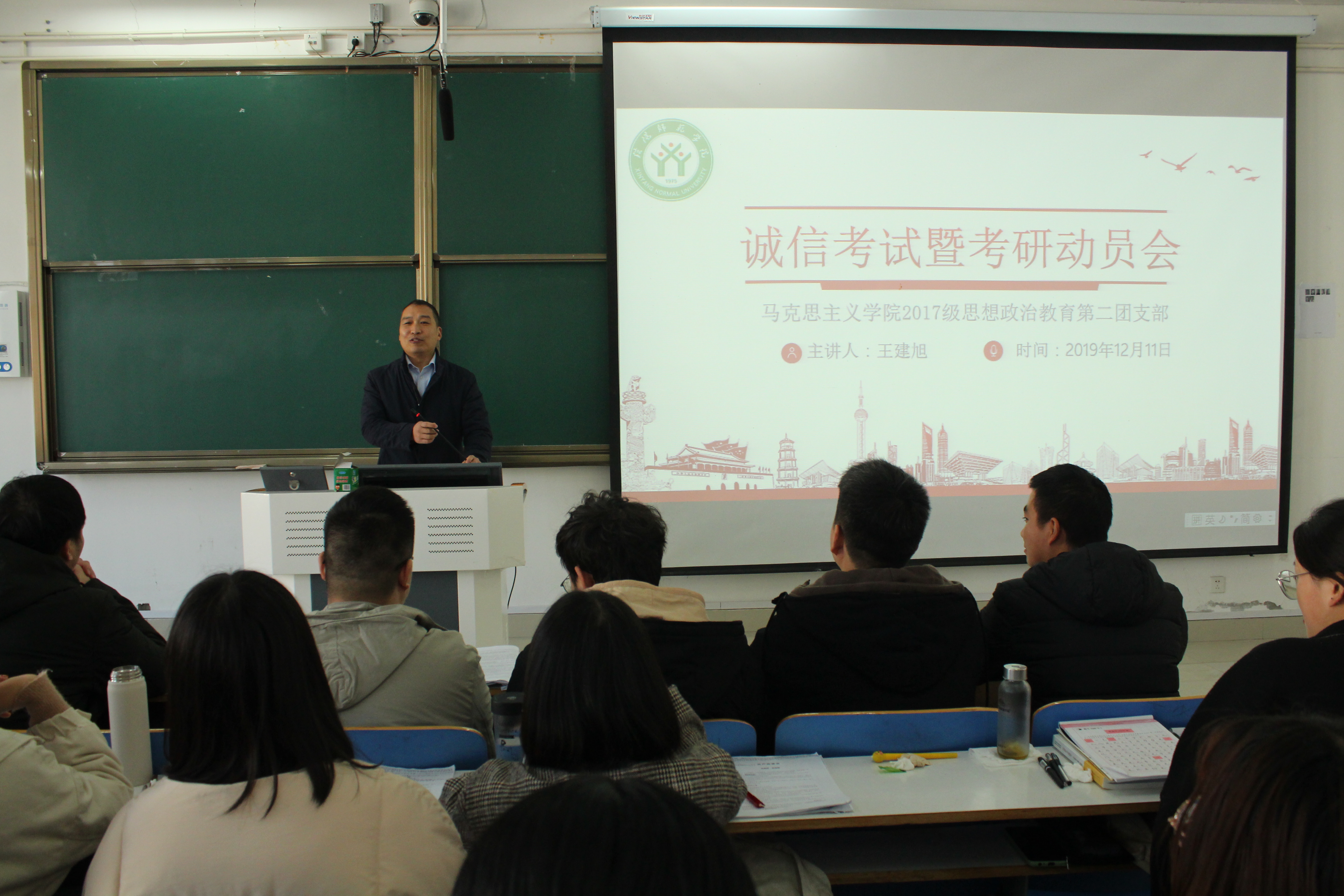 为强化纪律意识,充分调动学生的学习积极性,进一步坚定考研信心、明确目标方向。12月11日上午,德赢AC米兰官网2017级思想政治教育第二团支部在社科楼516教室顺利开展了诚信考试暨考研动员会。团支部第一支部书记王建旭,班级辅导员孙绪曙及2017级第二团支部全体成员共同参加。会议由孙绪曙主持。