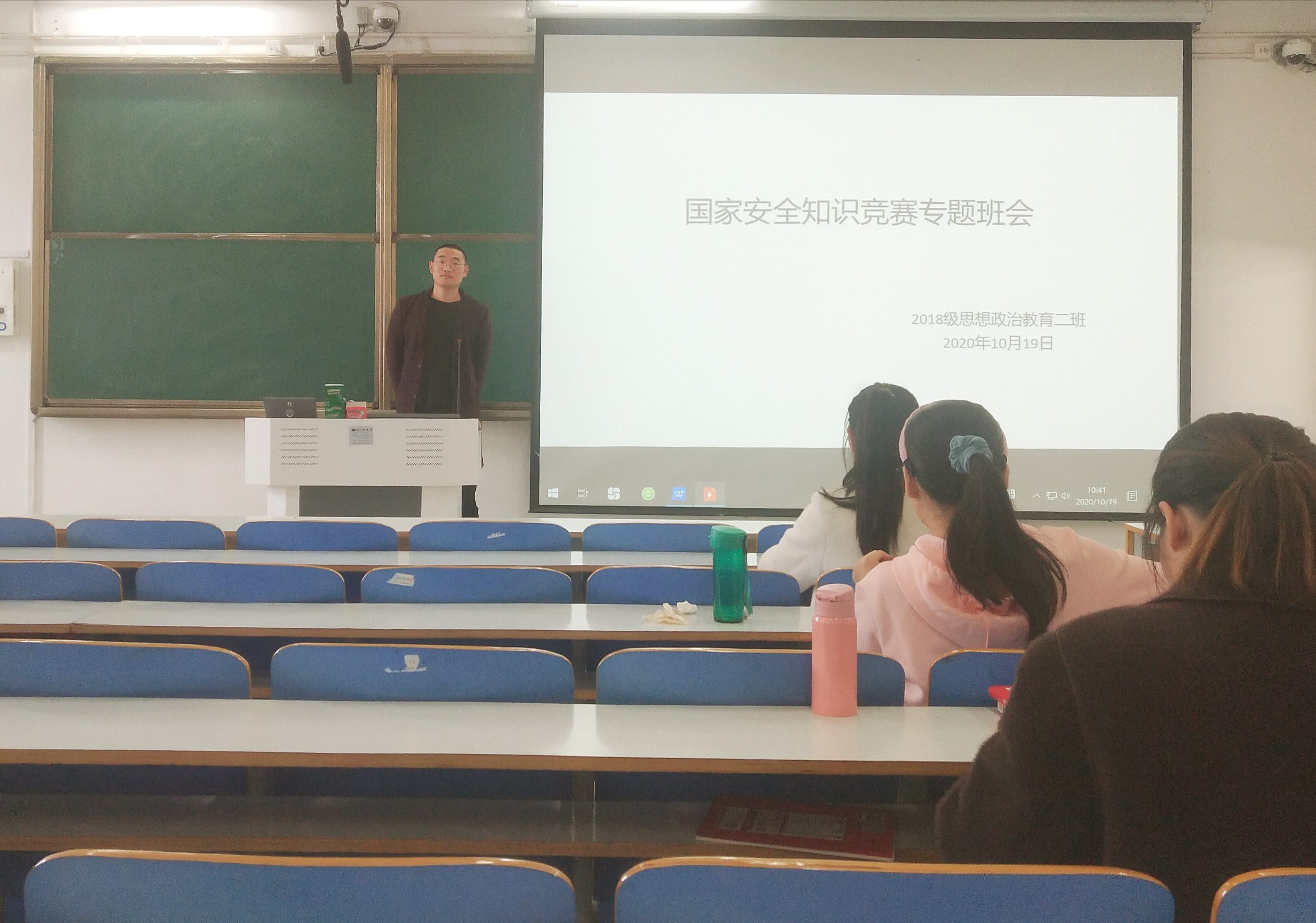 10月19日上午,德赢官网2018级思想政治教育二班在社科楼514教室顺利开展“国防安全知识竞赛”专题班会。2018级思想政治教育二班全体成员共同参加了此次班会。会议由班长杨康主持。