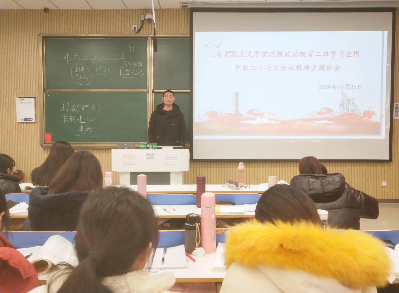 11月25日上午,德赢AC米兰官网2018级思想政治教育二班在社科楼515教室顺利开展学习中华全国学生联合会第二十七次代表大会精神主题班会。会议由班长杨康主持。