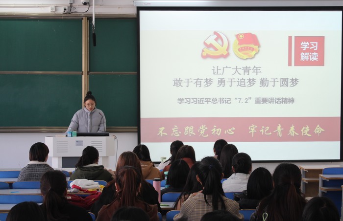 首先,李明瑶带领同学们学习了解习近平总书记7·2讲话的内容,“中共中央总书记、国家主席、国家军委主席习近平7月2日在中南海同团中央新一届领导班子集体谈话并发表重要讲话,他强调,青年一代有理想,有本领,有担当,国家就有前途,民族就有希望”。她讲到“7·2讲话,习近平总书记强调了要抓好三个根本性问题:必须把培养社会主义建设者和接班人作为根本任务、把巩固和扩大党执政的青年群众基础作为政治责任、把围绕中心服务大局作为主线,习总书记强调青年工作,抓住的是当下,传承的是根脉,面向的是未来,攸关党和国家前途命运。各级党委要关注关心青少年成长,为他们成长成才、施展才华创造良好条件。各级党委要拿出极大精力抓青年工作、抓共青团工作,切实尽到领导责任”。听完习总书记的讲话,同学们感受到作为一名青年的自豪感与责任感,感受到习近平总书记对青年所寄予的希望,定会以坚定的信念指引自身,不忘初心跟党走,牢记青春使命。(德赢AC米兰官网 黄文博 /供稿)