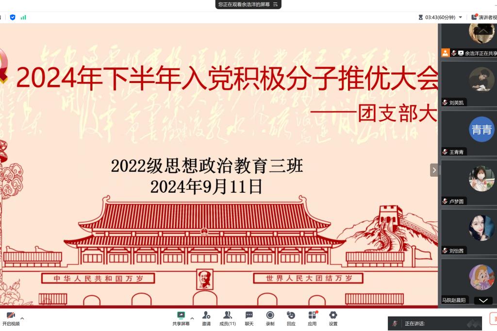 9月11日晚,德赢AC米兰官网2022级思想政治教育三班在线上腾讯会议召开入党积极分子推优大会。德赢官网2022级思想政治教育三班班主任任婷与班级全体团员共同参加此次大会。大会由团支书余浩洋主持。