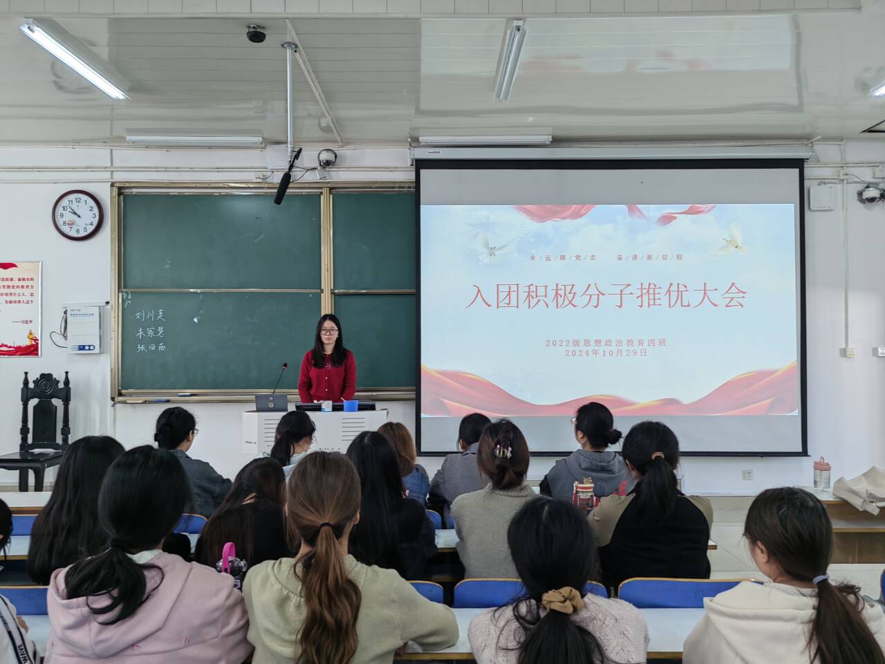 为深入推进全面从严治团,优化团员队伍规模结构,提高发展团员工作质量,10月29日上午,德赢AC米兰官网2022级思想政治教育四班在社科楼514教室组织召开“入团积极分子推优大会”。德赢官网2022级思想政治教育四班全体成员参与本次会议。本次会议由团支书牛志杰主持。