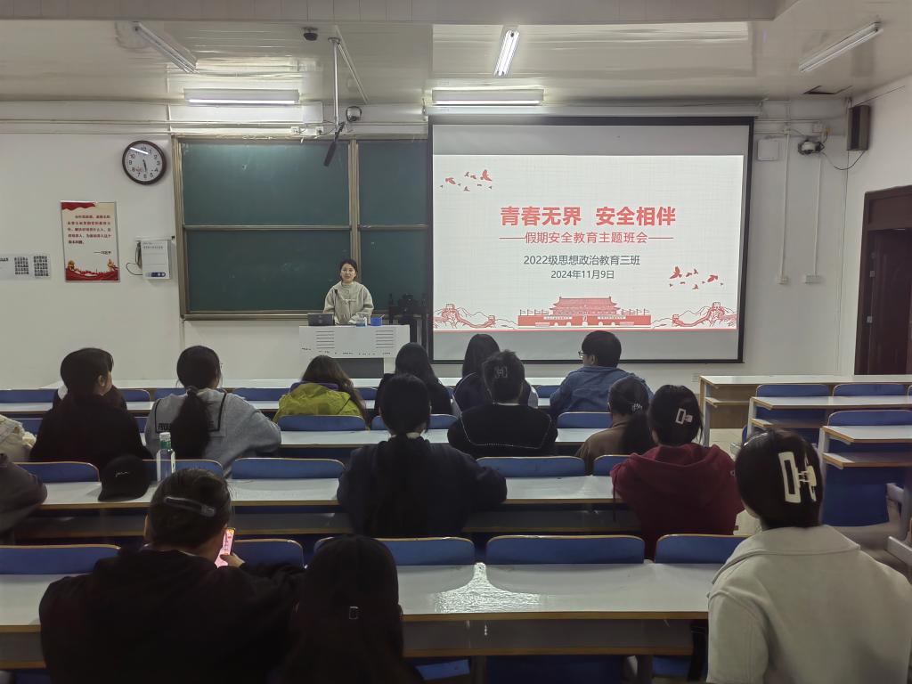 为进一步增强同学们的安全意识,提高防范意识,11月9日下午,德赢AC米兰官网2022级思想政治教育三班在社科楼514教室召开“青春无界,安全相伴”安全教育主题班会。德赢官网2022级思想政治教育三班班主任任婷和三班全体成员共同参与此次班会。班会由任婷主持。