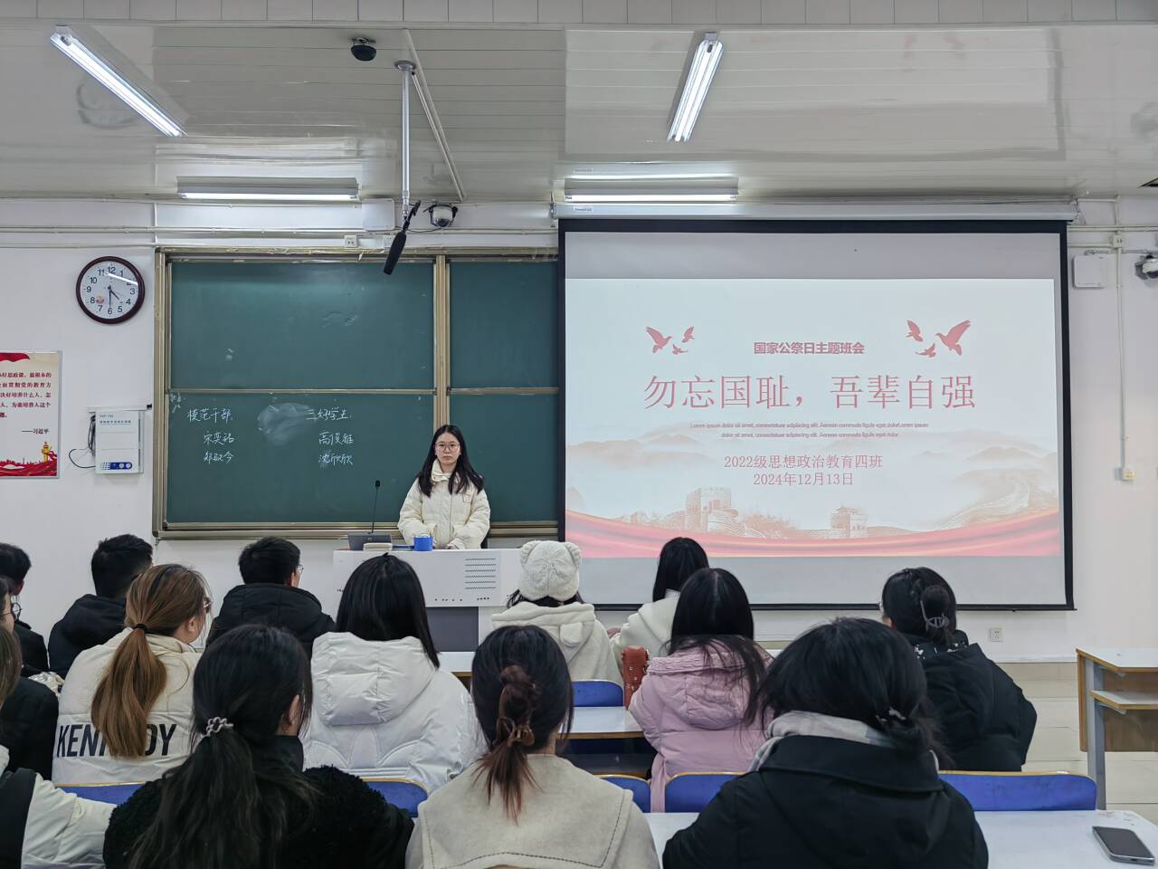 12月13日下午,德赢AC米兰官网2022级思想政治教育四班在社科楼514教室组织召开“勿忘国耻,吾辈自强”主题班会。德赢官网2022级思想政治教育四班全体成员参与本次班会。本次班会由班长牛志杰主持。