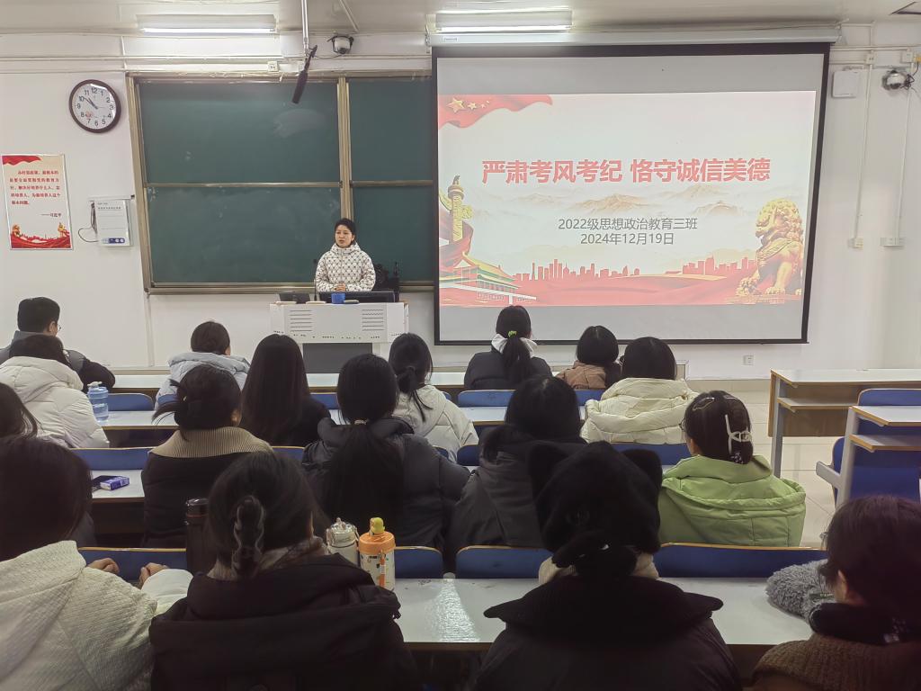 12月19日上午,德赢AC米兰官网2022级思想政治教育三班在社科楼514教室召开“严肃考风考纪,恪守诚信美德”主题班会。德赢官网2022级思想政治教育三班全体成员共同参与此次班会,班会由班主任任婷主持。