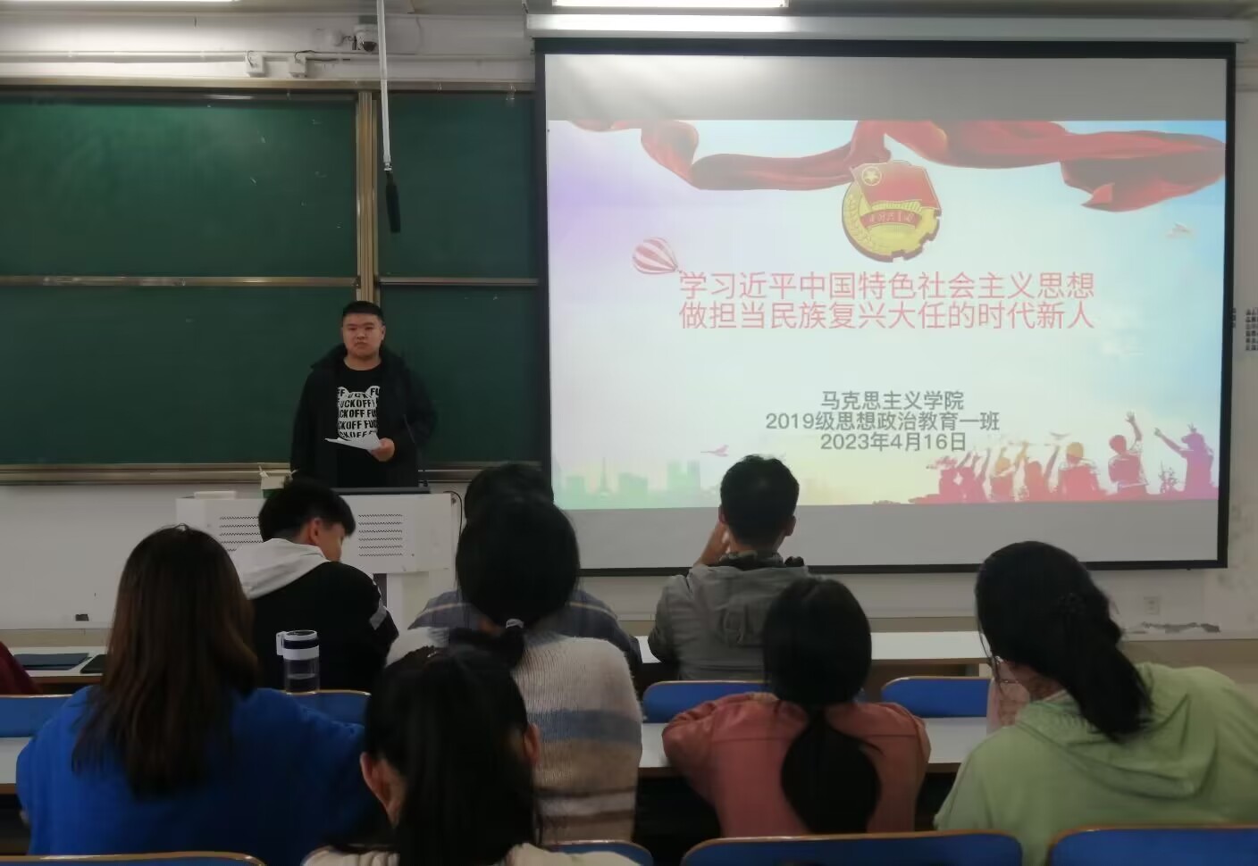 团课伊始,学习委员王小鹭向团员们强调了学习习近平新时代中国特色社会主义思想神的重要性。接着,团支书贾子漪通过播放视频、PPT等方式,围绕“学习近平新时代中国特色社会主义思想,做担当民族复兴大任的时代新人”这一主题进行深入讲解,带领同学们深入了解本次团课的主要学习内容。最后,她邀请雷诗雨、詹桢妮、王梦雅等同学上台逐一分享有关本次团课的所思所想。团课在团员的掌声中落下帷幕。