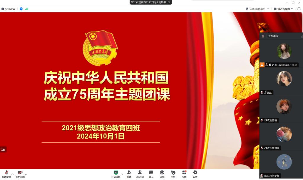 10月1日上午,德赢AC米兰官网2021级思想政治教育四班在腾讯会议开展“庆祝中华人民共和国成立75周年”主题团课。2021级思想政治教育四班全体同学参加本次团课。团课由团支书刘珂含主持。