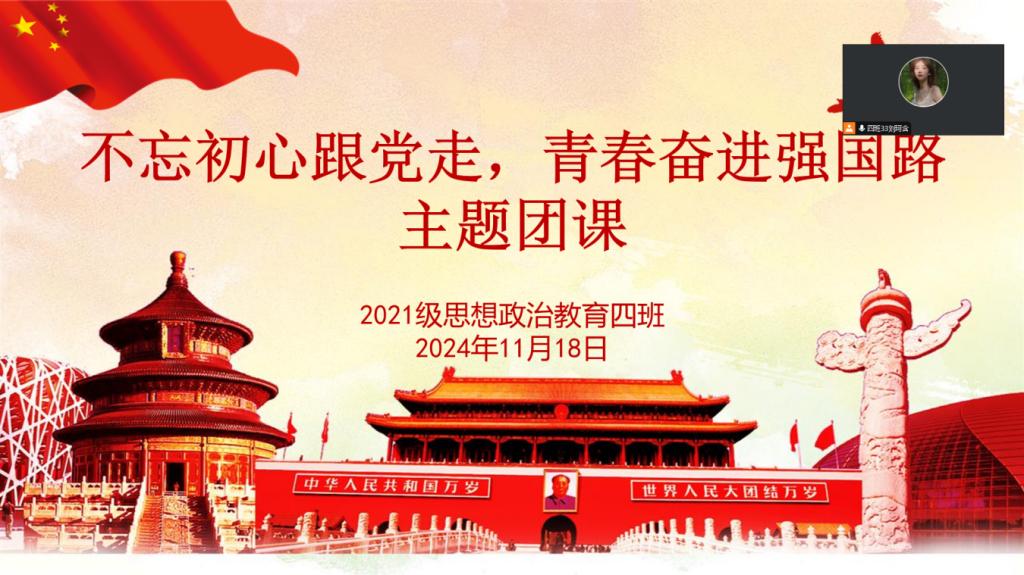 10月18日上午,德赢AC米兰官网2021级思想政治教育四班在腾讯会议开展“不忘初心跟党走,青春奋进强国路”主题团课。2021级思想政治教育四班全体学生共同参加本次团课。团课由团支书刘珂含主持。