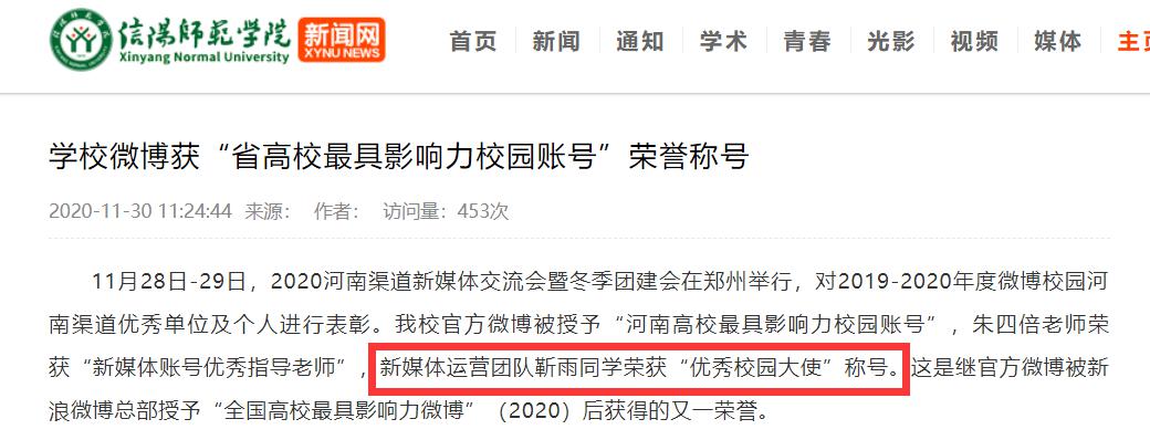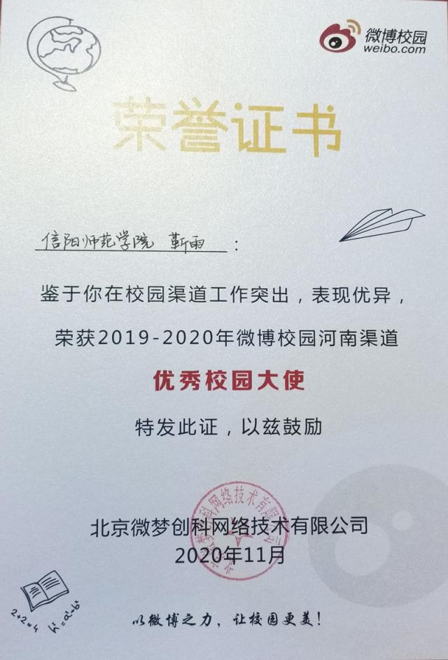 1、2020年11月,在微博校园河南渠道表现优异,荣获“优秀校园大使”称号